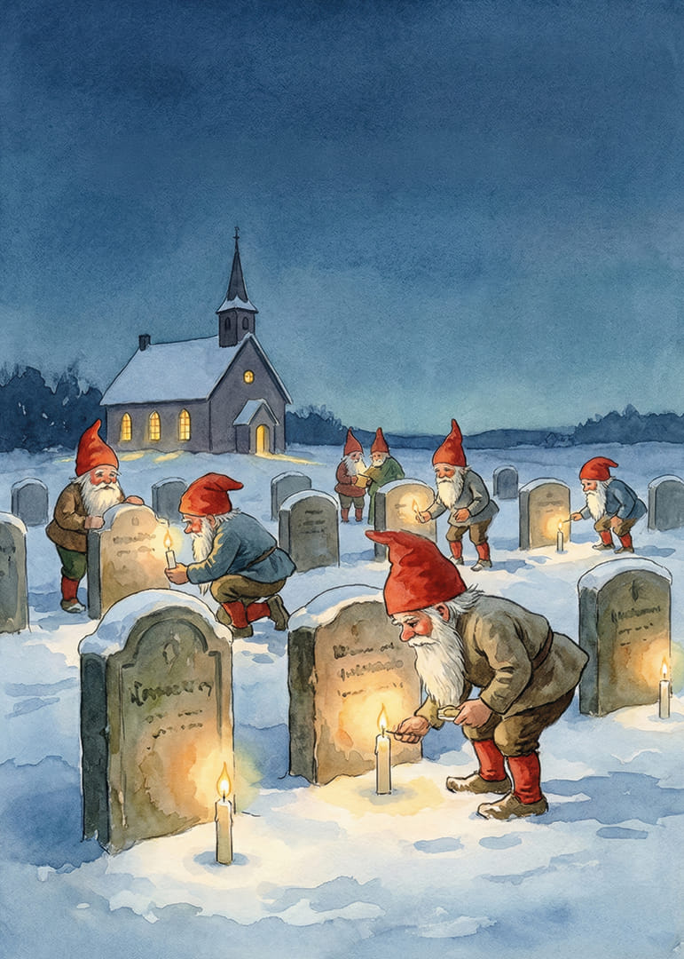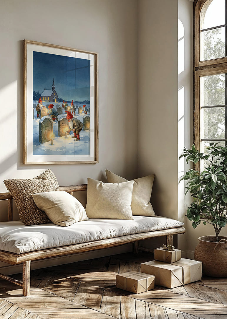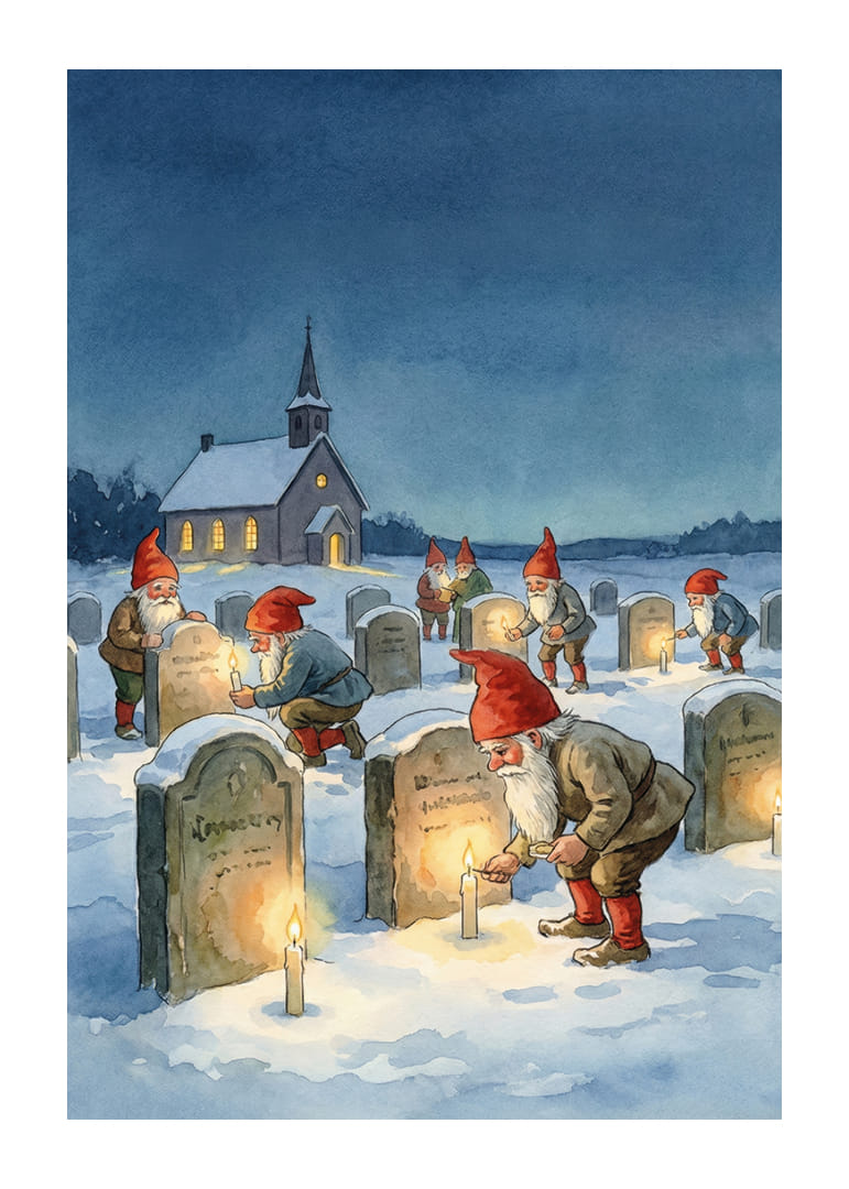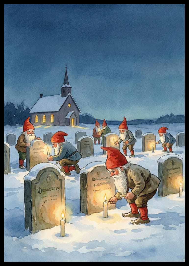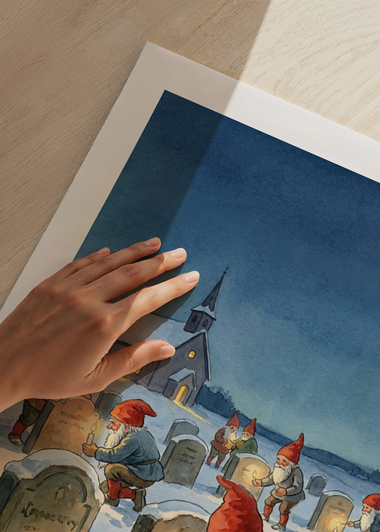 In a magical winter landscape, elves are seen gently lighting candles at gravestones under a starry sky. The peaceful glow from the candles and the small church in the background create a sense of mystery and tranquility. This beautiful poster brings a peaceful and dreamy atmosphere to any room it hangs in, evoking thoughts of winter tales and timeless devotion