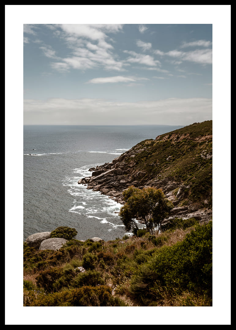 A beautiful coastal landscape along Cape Town's dramatic peninsula, where the open expanse of the Atlantic meets cliffs, greenery and wind-shaped lines. The horizon lies far away and the waves break gently against the shore in a calm rhythm. A poster that captures the presence and spaciousness of nature