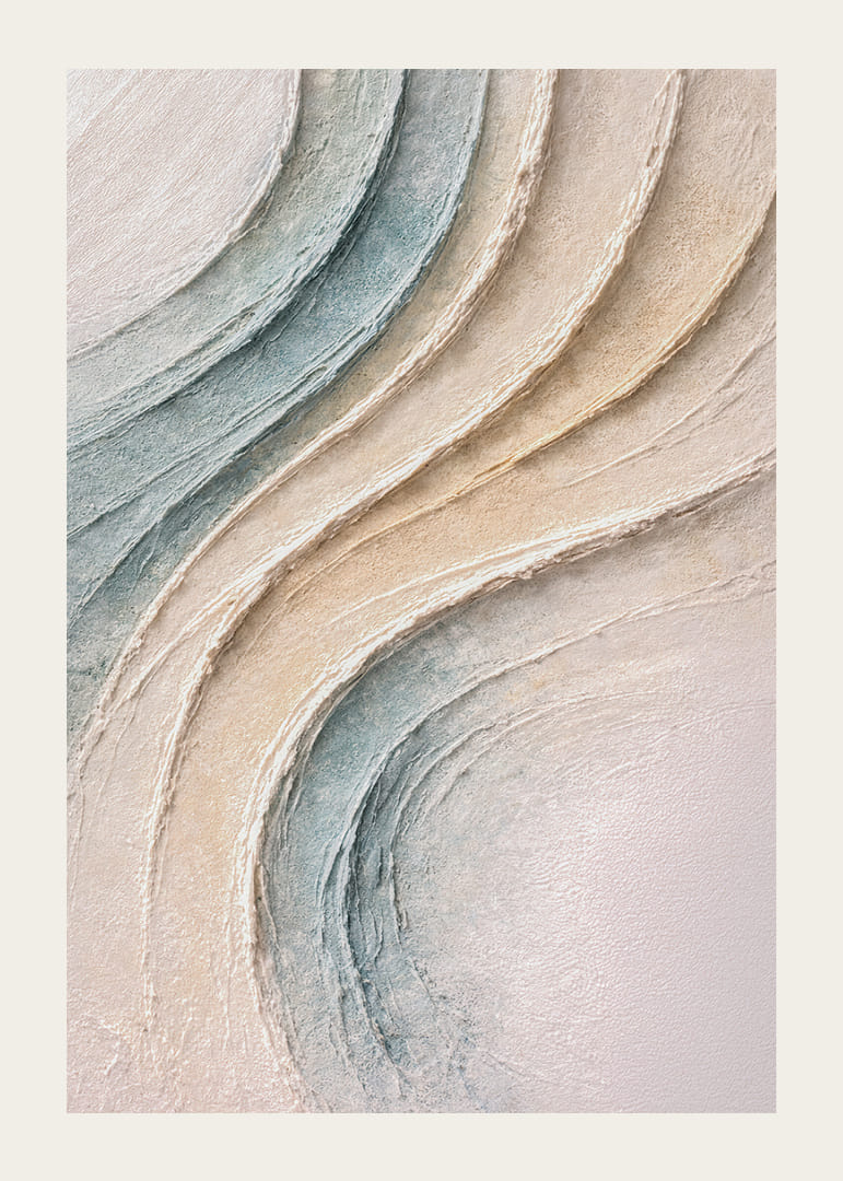 This poster catches the eye with its soft, undulating shapes and gentle pastel tones reminiscent of calm sand dunes or gentle ocean waves. The captivating texture and subtle shades create a sense of calm and balance. Place this poster in your living room to add a sense of harmony to the room and renew its visual and emotional expression, creating a peaceful atmosphere.
