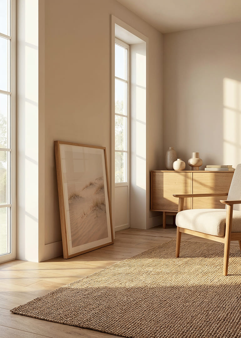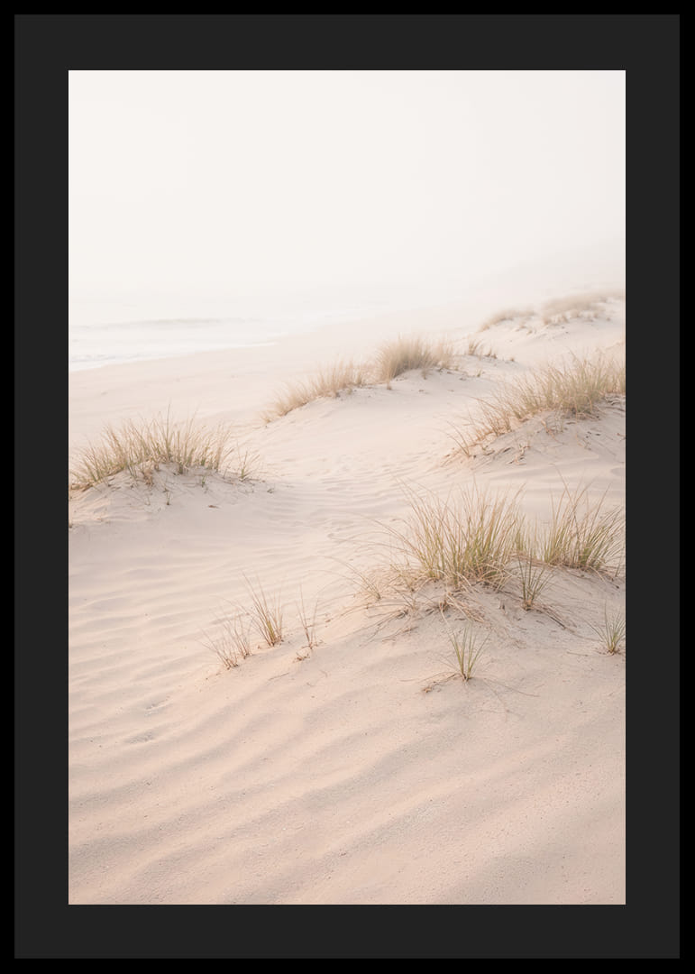 This poster captures an endless peace with its soft sand dunes swept into a dreamlike light. With subtle shades of beige and pink, it offers a calming atmosphere where each grain of sand seems to whisper secrets from the sea breeze. A perfect detail to transform any room into a harmonious oasis, where the poster's calming mood permeates the entire space.