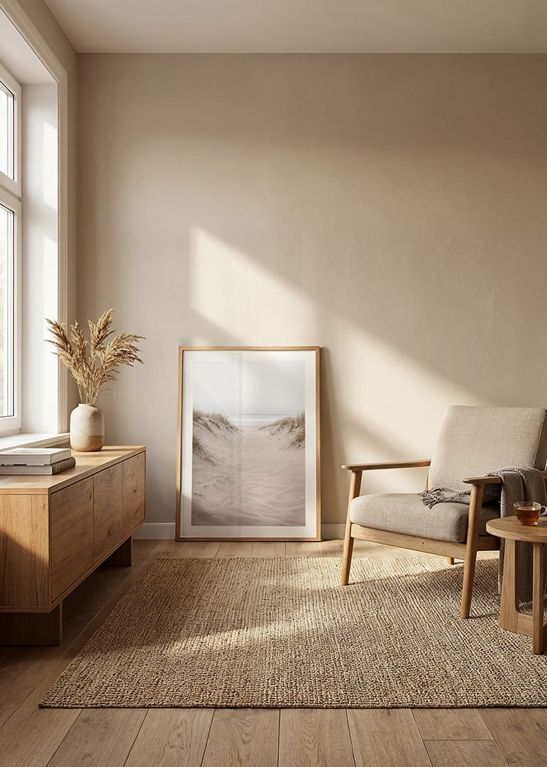 This poster captures a soft, peaceful path through sand dunes leading towards the horizon where the sea meets the sky. The subtle sand colours and subdued light create a sense of calm and infinity. When you hang this poster in your living room, a sense of openness and tranquility will arise, perfect for creating a relaxing oasis in your home.