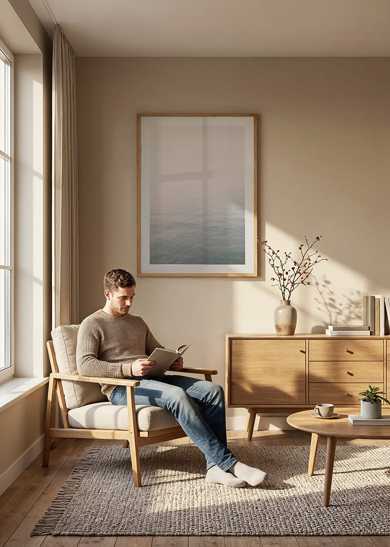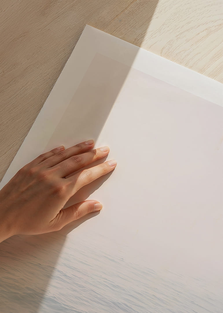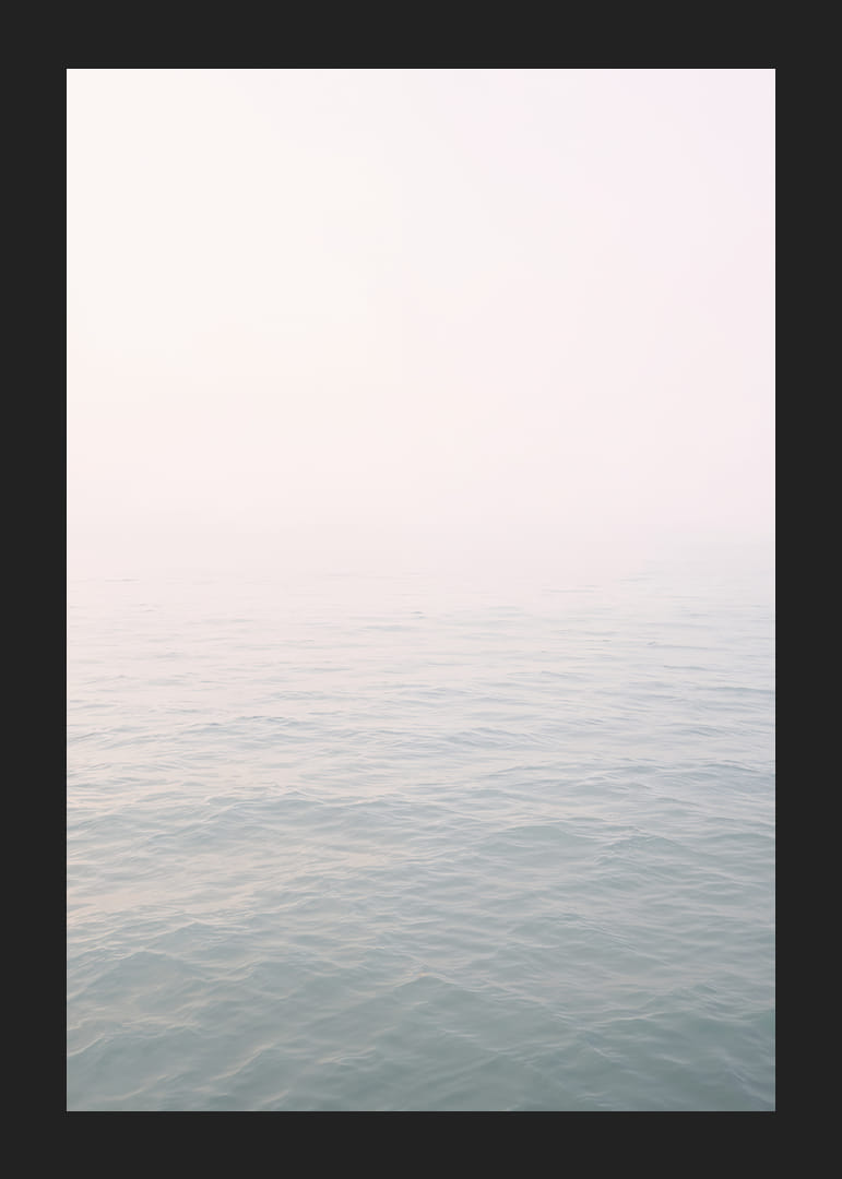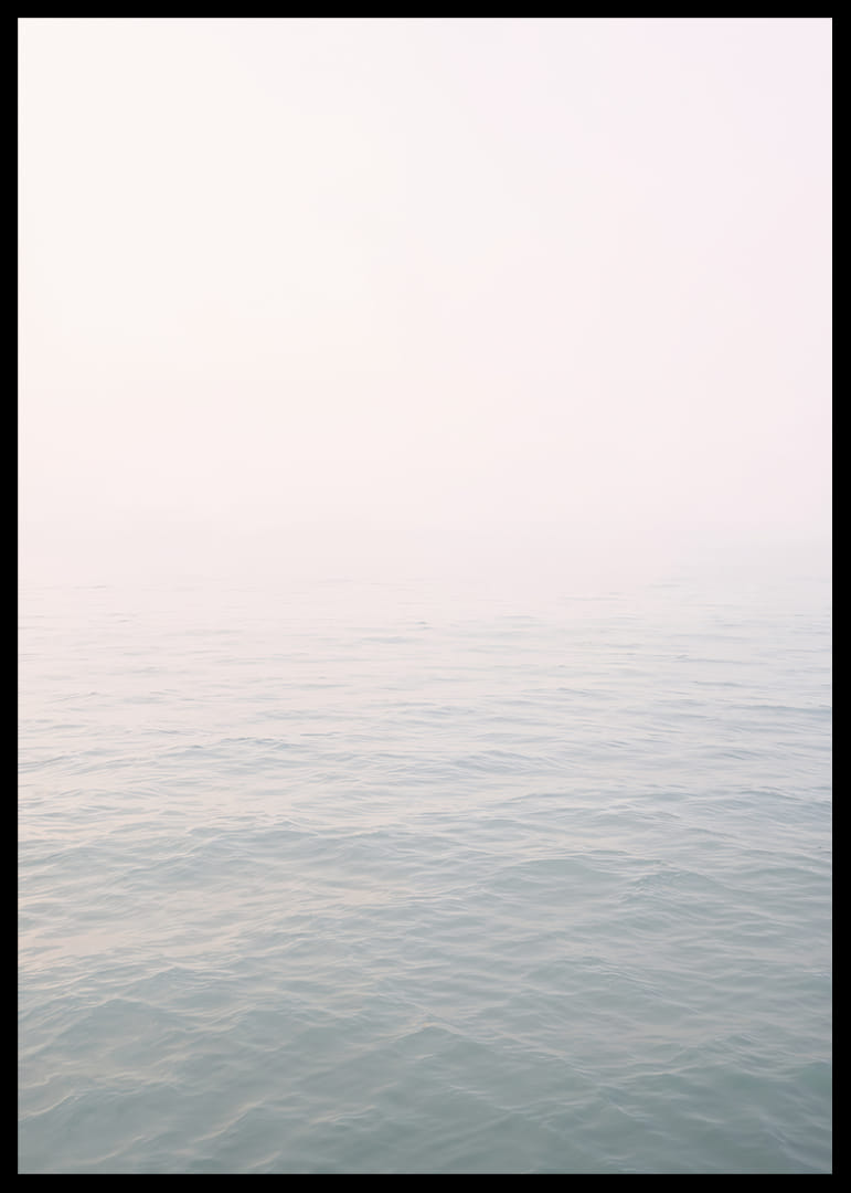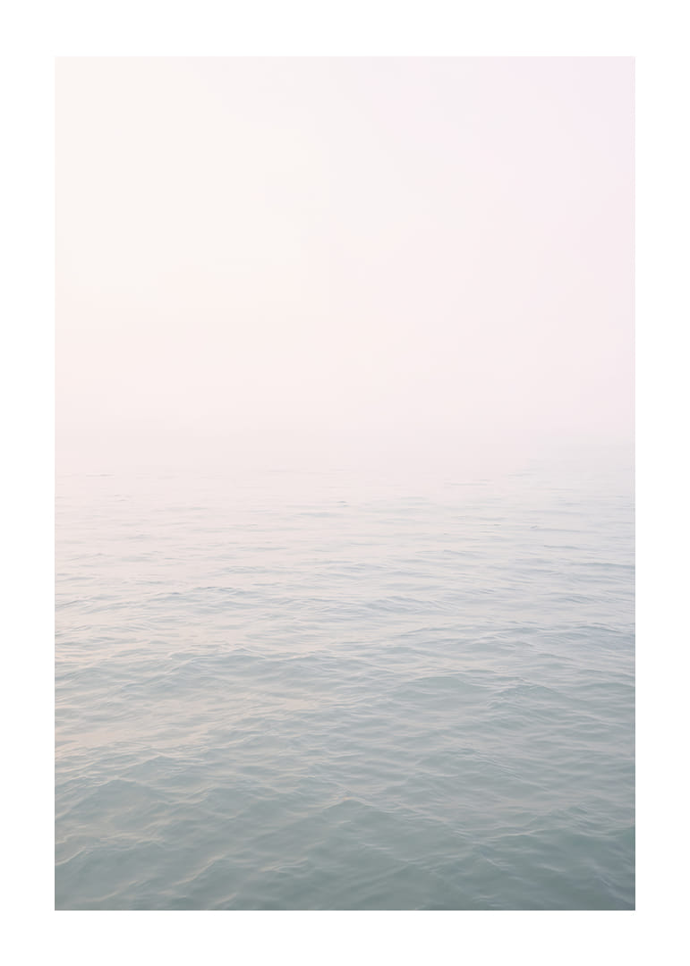 This poster captures the tranquility of an endless ocean merging with a bright sky in fog. The soft meeting of sky and sea creates a sense of calm and eternity. The shade of blue and subtle pink enhance the dreamlike atmosphere. This poster gives the room a pleasant and meditative atmosphere, perfect for creating a haven of peace in your home.