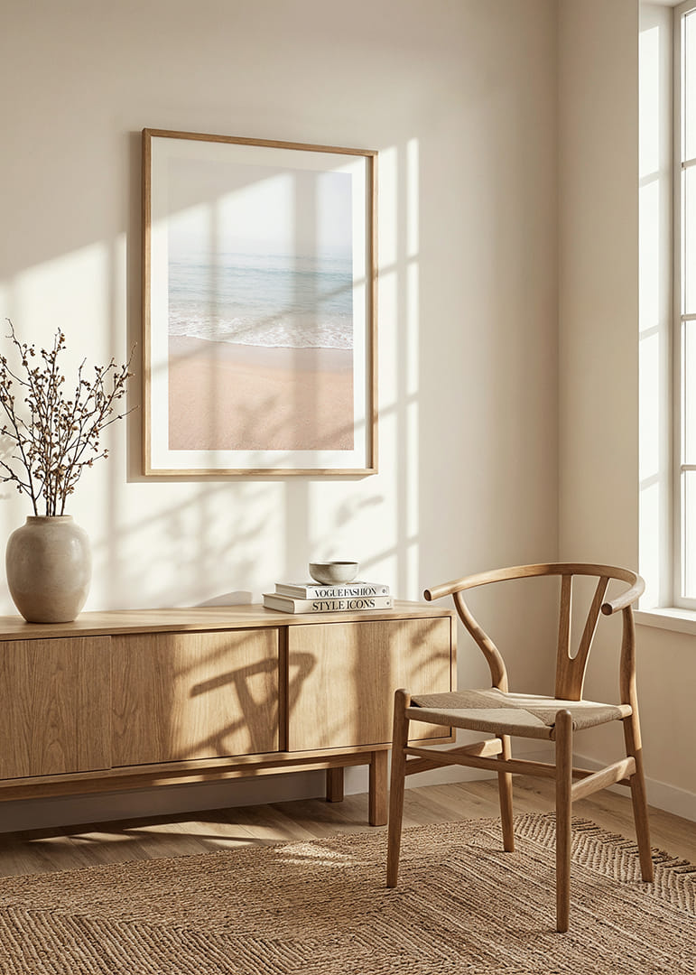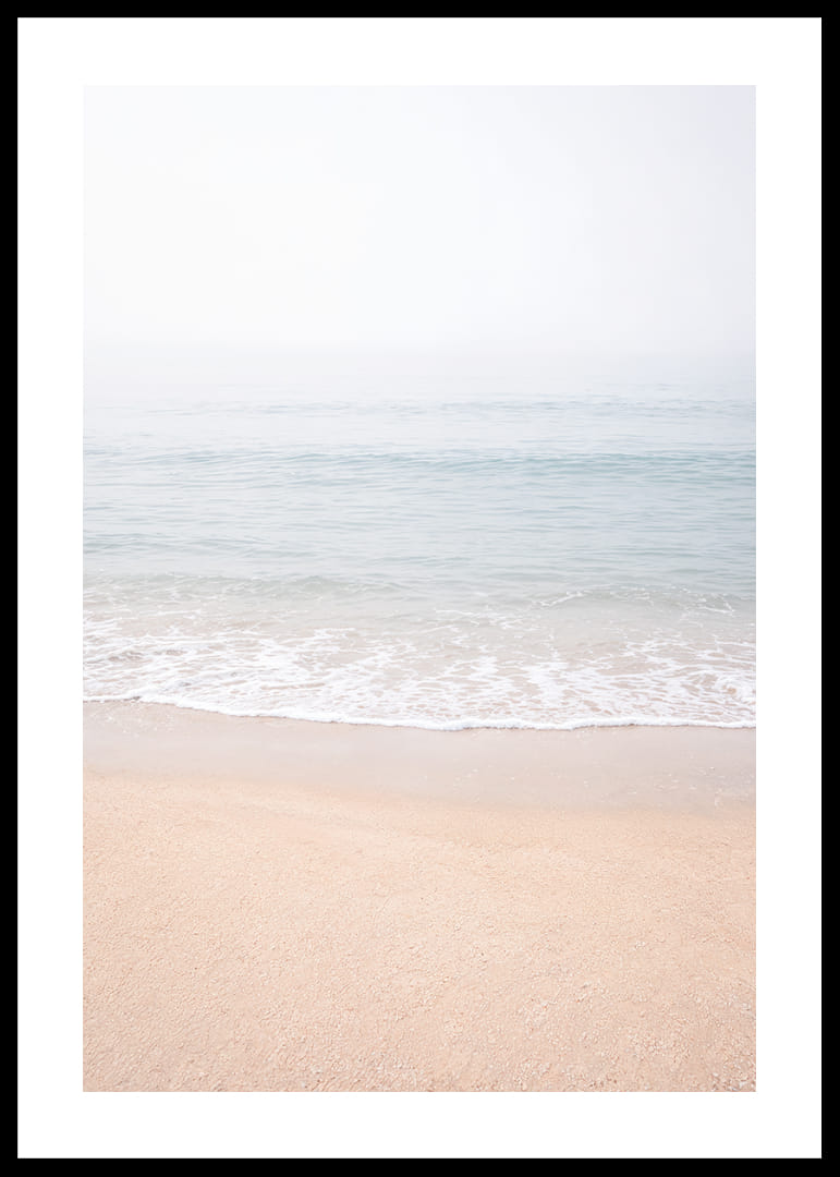 This poster captures the enchanting coastline where mist merges with soft sand and calm sea. The water shimmers in light turquoise tones, creating a sense of peace and balance. The poster's delicate interplay of colors and shapes adds a calm, restful atmosphere to any room it hangs in. Perfect for creating a peaceful space where your thoughts can wander freely.