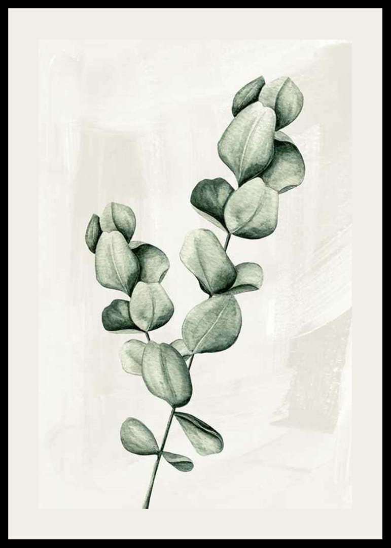 Poster with beautiful watercolor illustration on green eucalyptus leaves on a twig against a background with brush stroke structure.