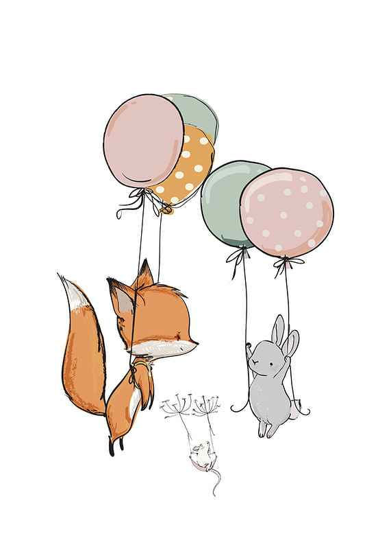 Nice poster for the children's room with illustration of three cute little animals, a fox, a rabbit and a little mouse, which hangs in balloons.