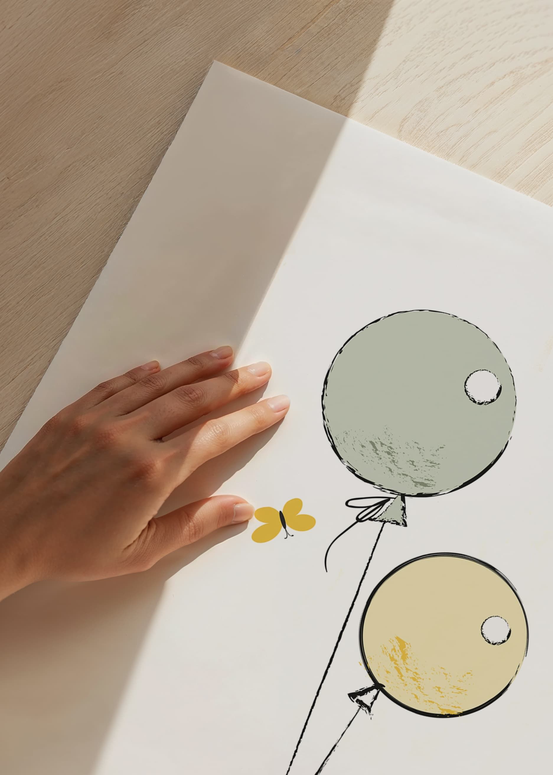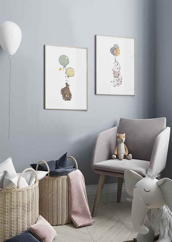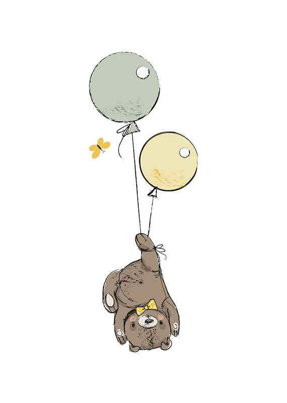 Nice poster for the children's room with illustration of a cute little teddy bear hanging upside down in balloons.
