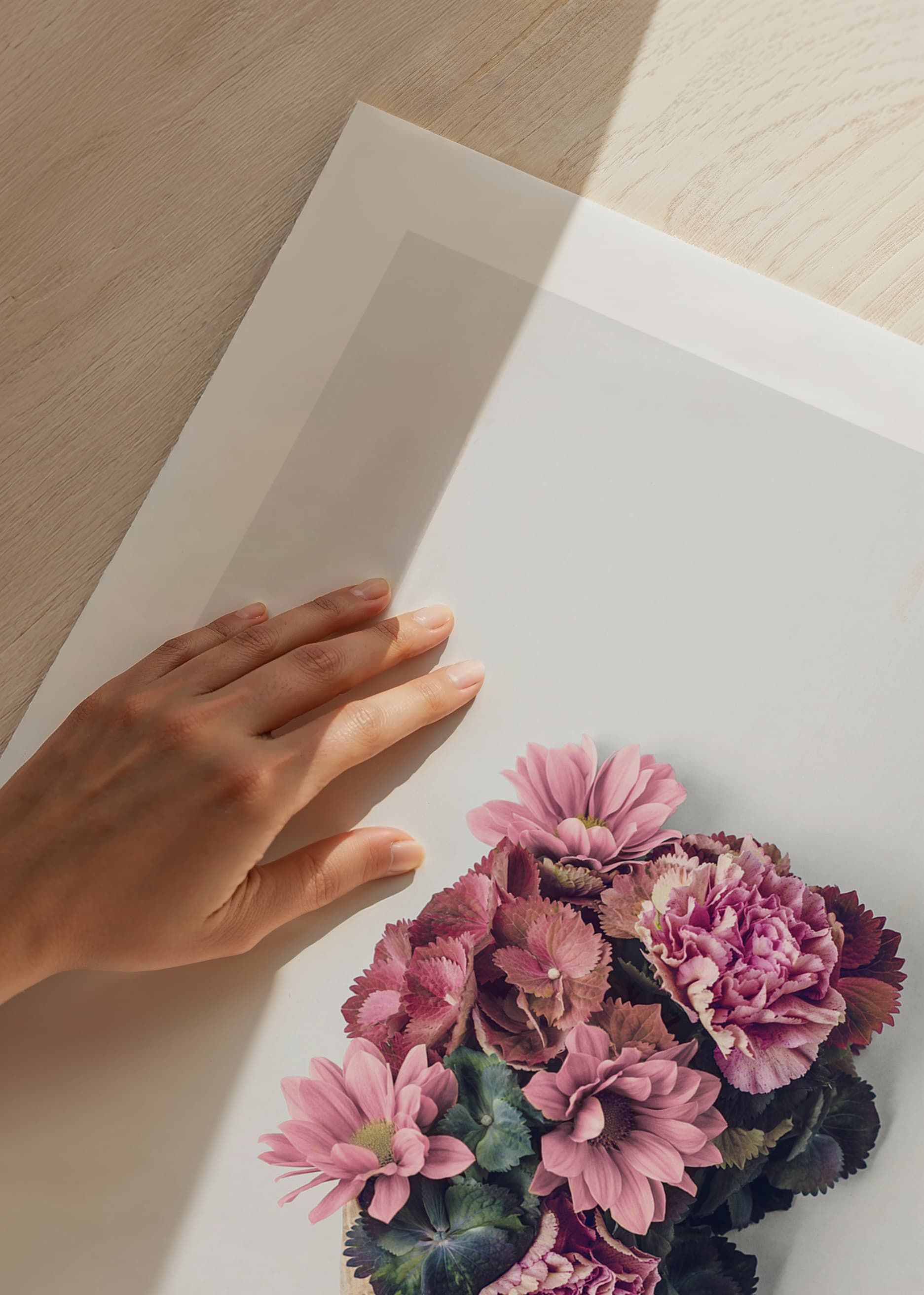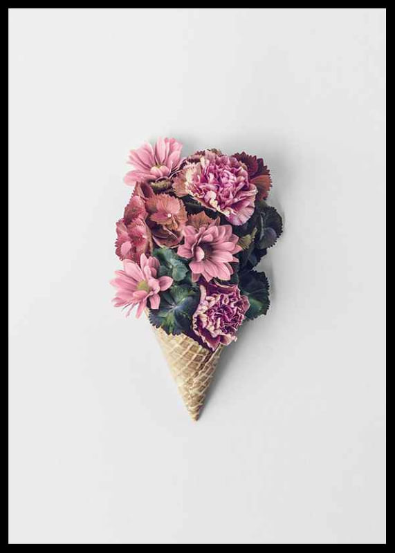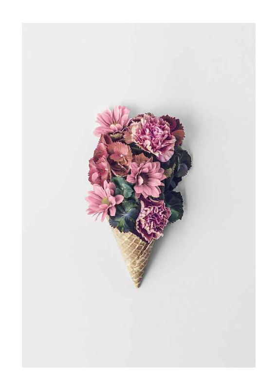 Several pink and purple flowers, including carnations and chrysanthemums, are arranged in a classic waffle cone against a light gray, minimalist background. The combination of flowers and ice cream cone gives the poster a playful yet stylish feel, great for spring refreshment in the kitchen, hallway or living room.