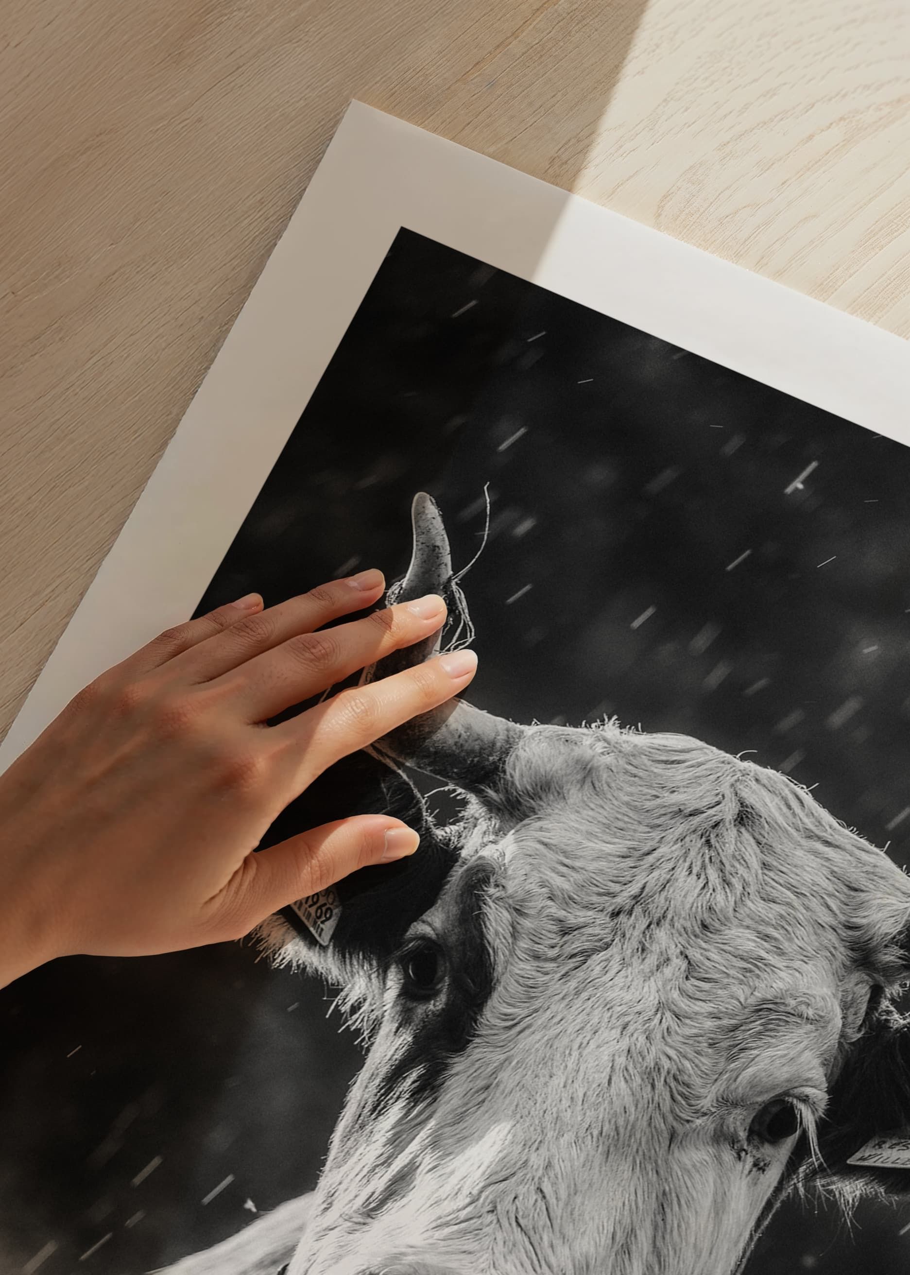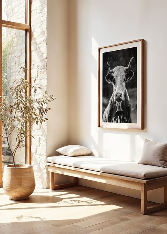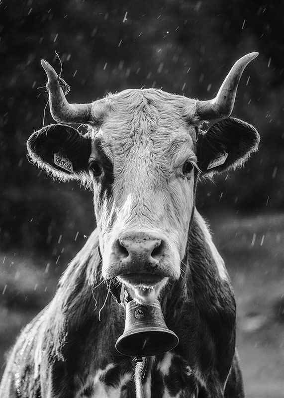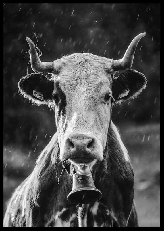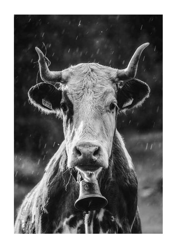 A close-up of a cow with distinct horns and a bell around its neck, captured in black and white during a light rain. The motif is characterized by the cow's attentive gaze and the natural light against a blurred background. This poster gives a rustic touch and nicely complements other motifs in black and white tones, for example in a kitchen or living room.