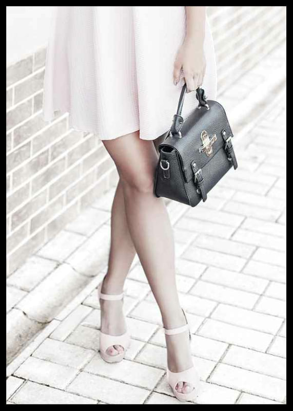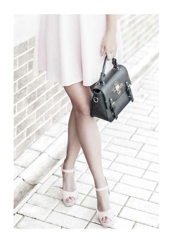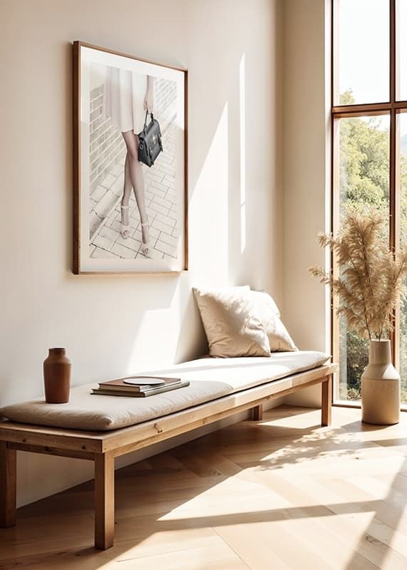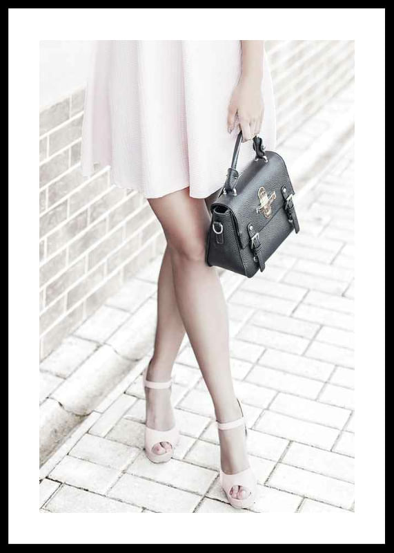 The motif consists of a young woman wearing a light pink dress and matching sandals. She is holding a black handbag with silver details and stands against a light stone surface next to a brick wall. This poster gives a modern and spring-inspired expression that is suitable for a hallway, bedroom or walk-in closet.