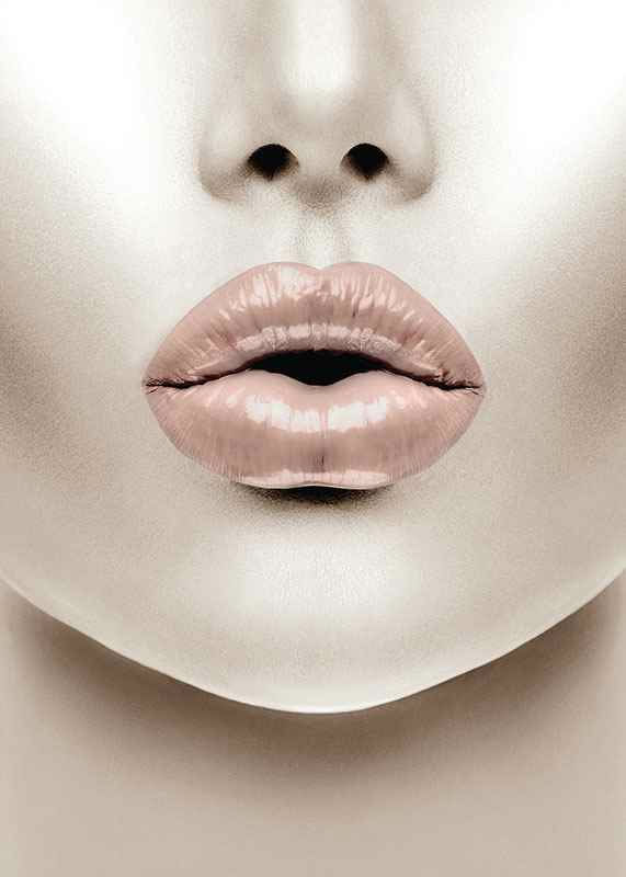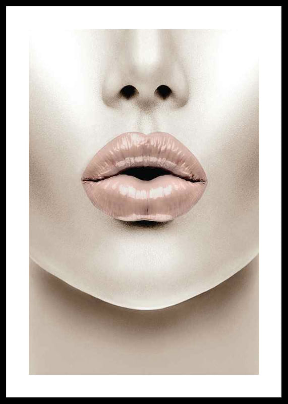 A close-up of a face with a focus on full lips in a light pink shade and a glossy finish. The skin tones are neutral and the background is kept clean, giving a modern and graphic expression. This poster adds a fashion-inspired accent and is perfect for bedrooms or dressing rooms, for example.