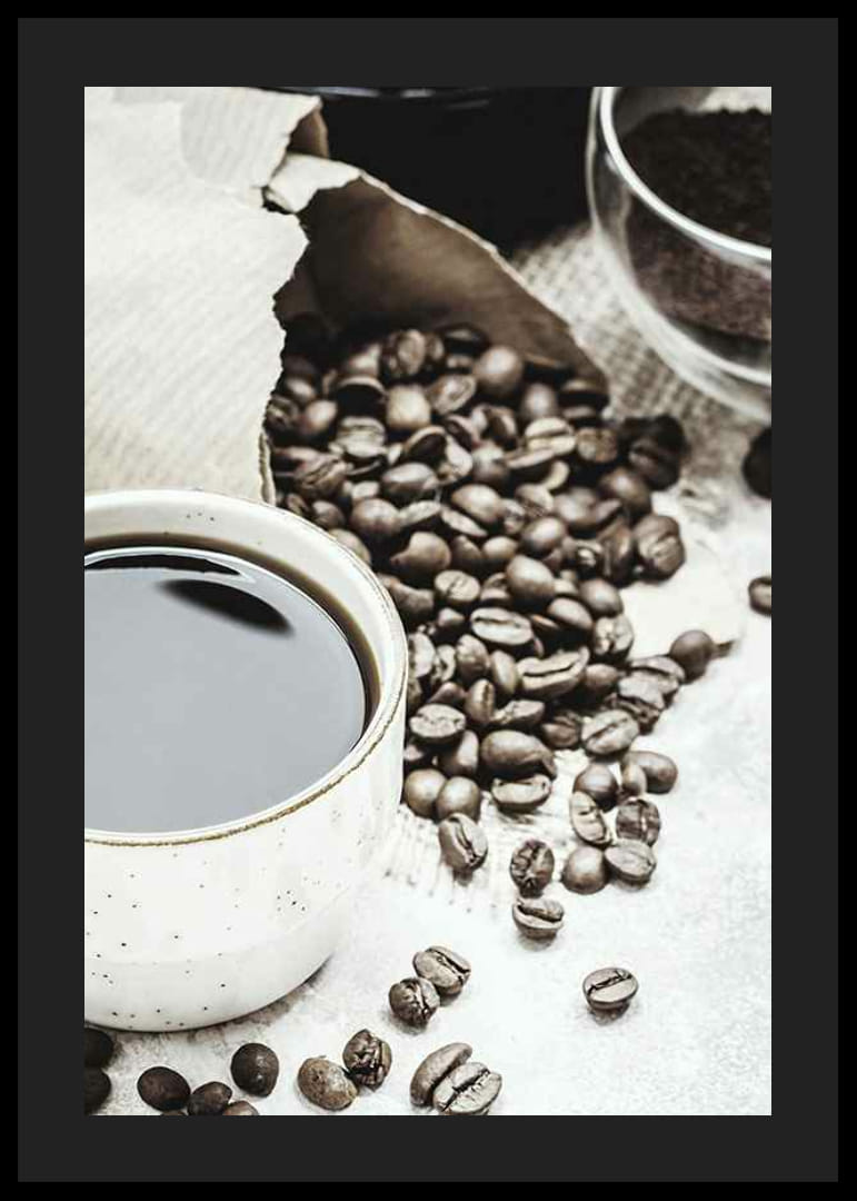 A close-up of a cup of black coffee next to scattered coffee beans and an opened paper package. Warm brown and beige shades dominate the motif, creating an inviting feel. This poster highlights the character of coffee and is particularly suitable for kitchens or dining rooms where everyday life takes center stage.