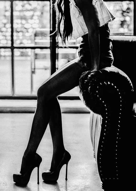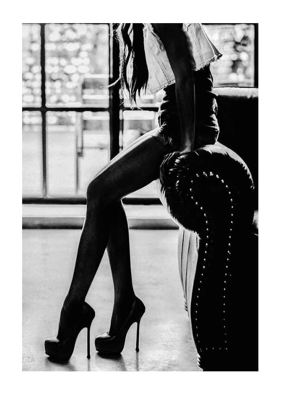 Silhouette of a young woman leaning against a leather armchair, wearing high heels and a short top. The light behind creates clear contrasts that highlight the legs and the stylish fashion. With its timeless expression, this poster fits in modern homes and can give a graphic feel to a hallway or bedroom.