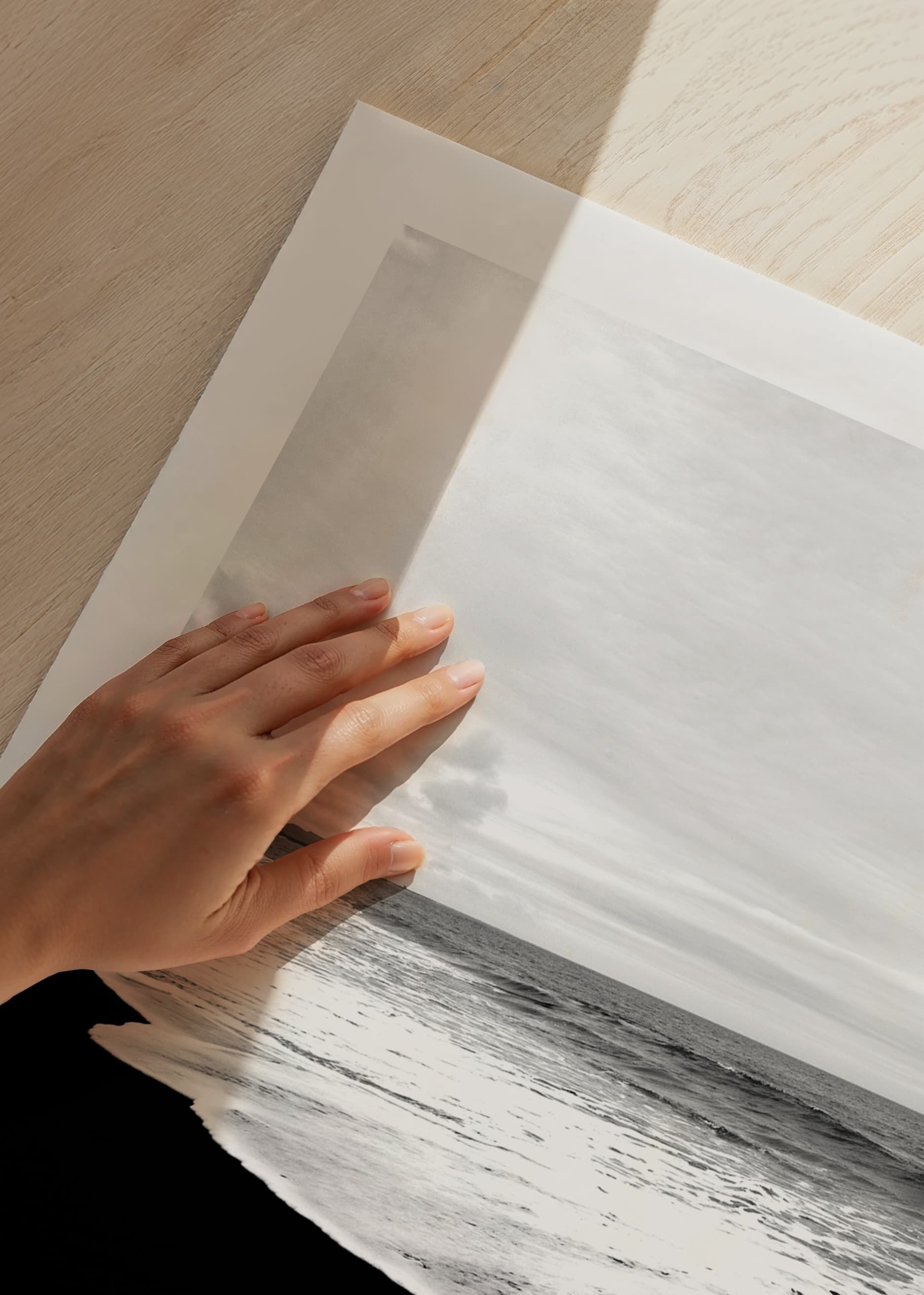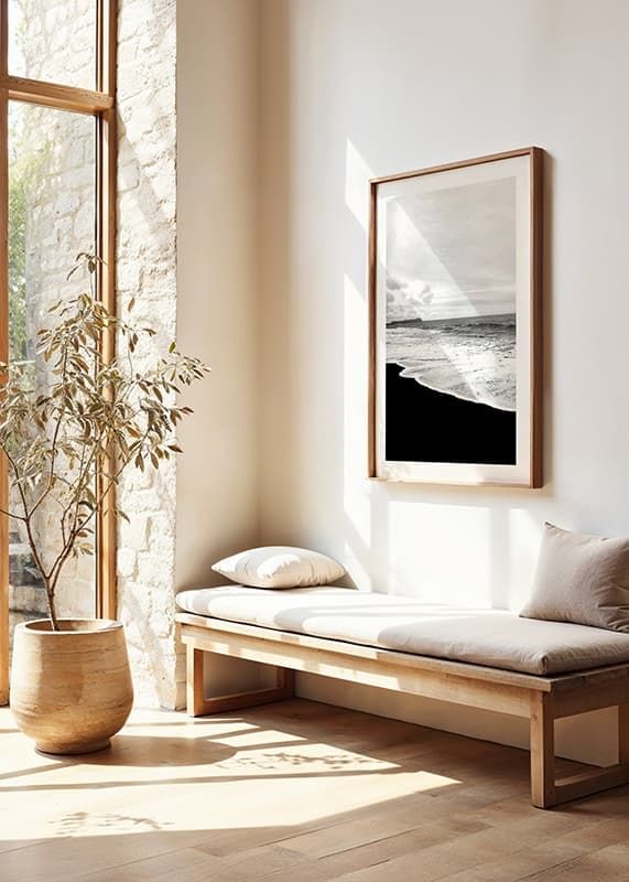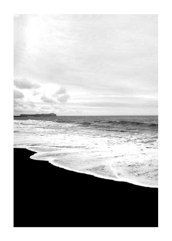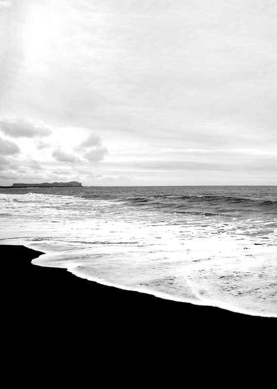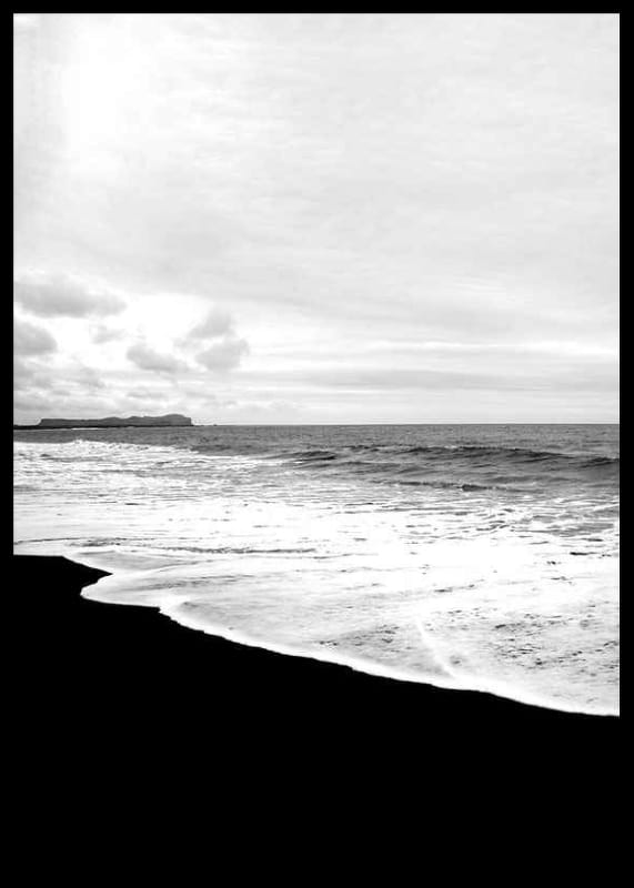 The landscape consists of a dark sandy beach where white sea foam meets the shore under a cloudy sky. The photo is in black and white and captures the contrast between the deep tones of the sand and the bright water. This poster is suitable for rooms where you want a calm, natural feeling with a graphic character.