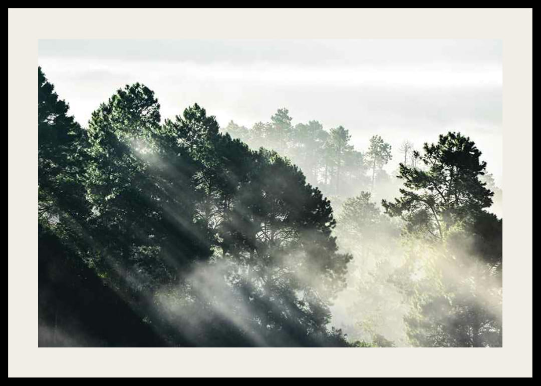 Sunbeams break through misty curtains over a dense spruce forest, creating depth and contrast in the motif. The dark green treetops stand out against a light background where the morning mist remains. This poster fits well in a living room or hallway and contributes a sense of nature and a calm atmosphere to the interior.