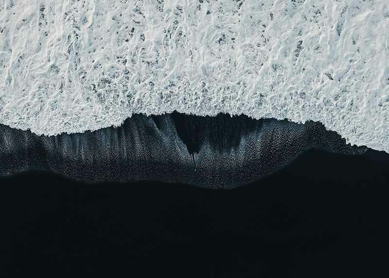 The contrast between foamy white ocean waves and deep black sand dominates the motif, captured from above in a bird's eye view. The undulating shapes create a graphic expression with natural patterns. This poster gives a stylish and modern impression and is suitable for rooms where you want to add the drama of nature in a subtle way.