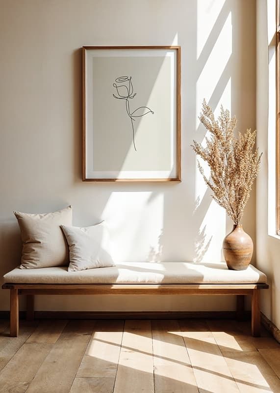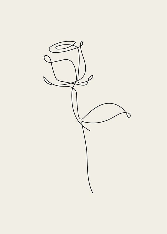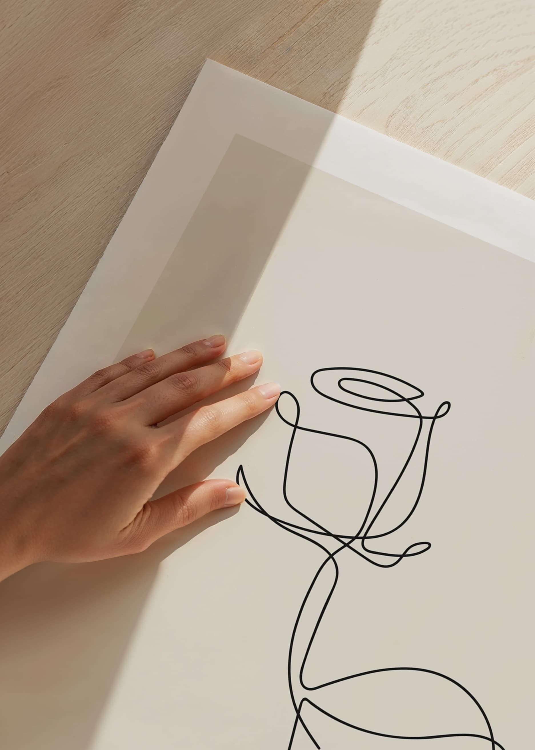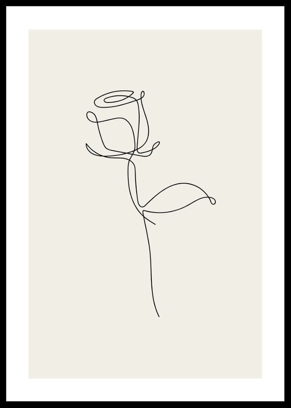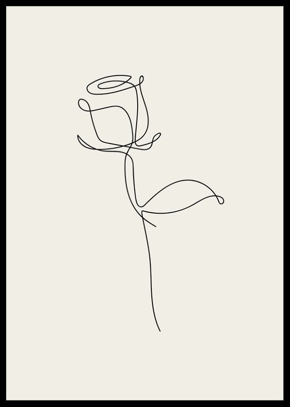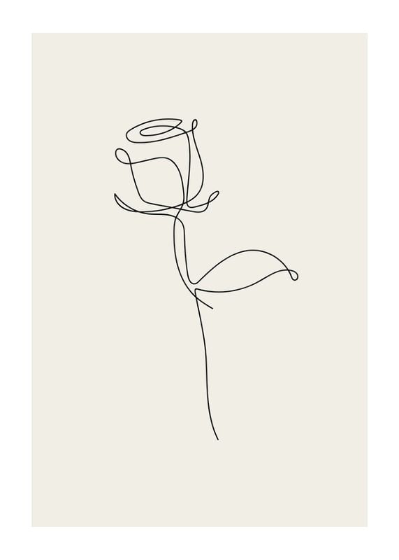 A stylish rose drawn in a single line is placed against a matte sand-colored background. The motif is dominated by thin black lines that shape the flower, leaves and stem in an airy composition. The poster fits in everything from bedrooms to hallways where the tight line creates a graphic and modern feel in the room.