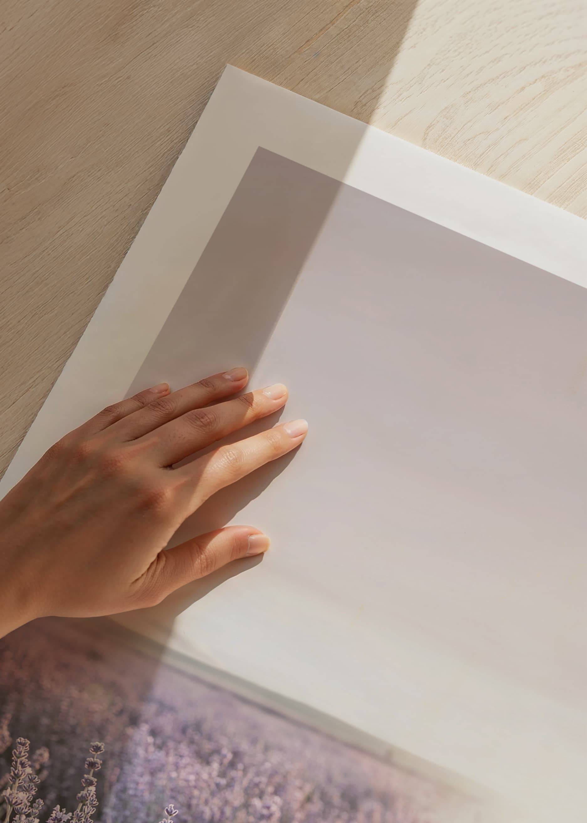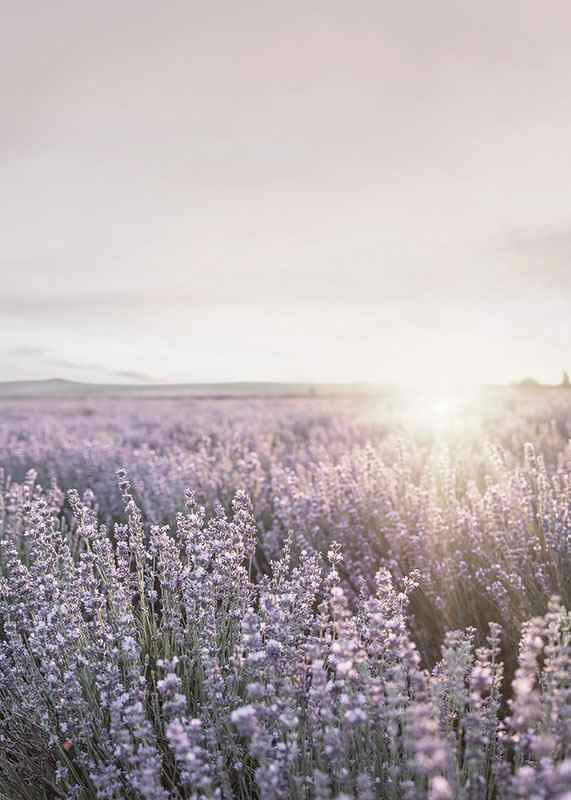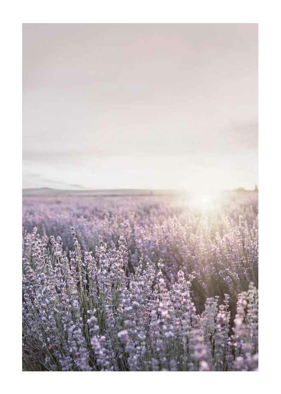 A vast lavender field in Provence fills the foreground with purple tones, while the sun sets over the horizon, creating a soft, warm light. The open landscape gives the poster an airy and relaxing expression. Suitable for living rooms, bedrooms or summer cottages where a feeling of summer nature is desired.