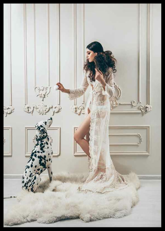 A woman wearing a long, transparent lace dress stands on a soft, white carpet with a Dalmatian. The background is a classic, brightly decorated wall with ornate details. This poster conveys a sense of sophisticated fashion and is suitable for rooms where you want to create a tasteful impression.