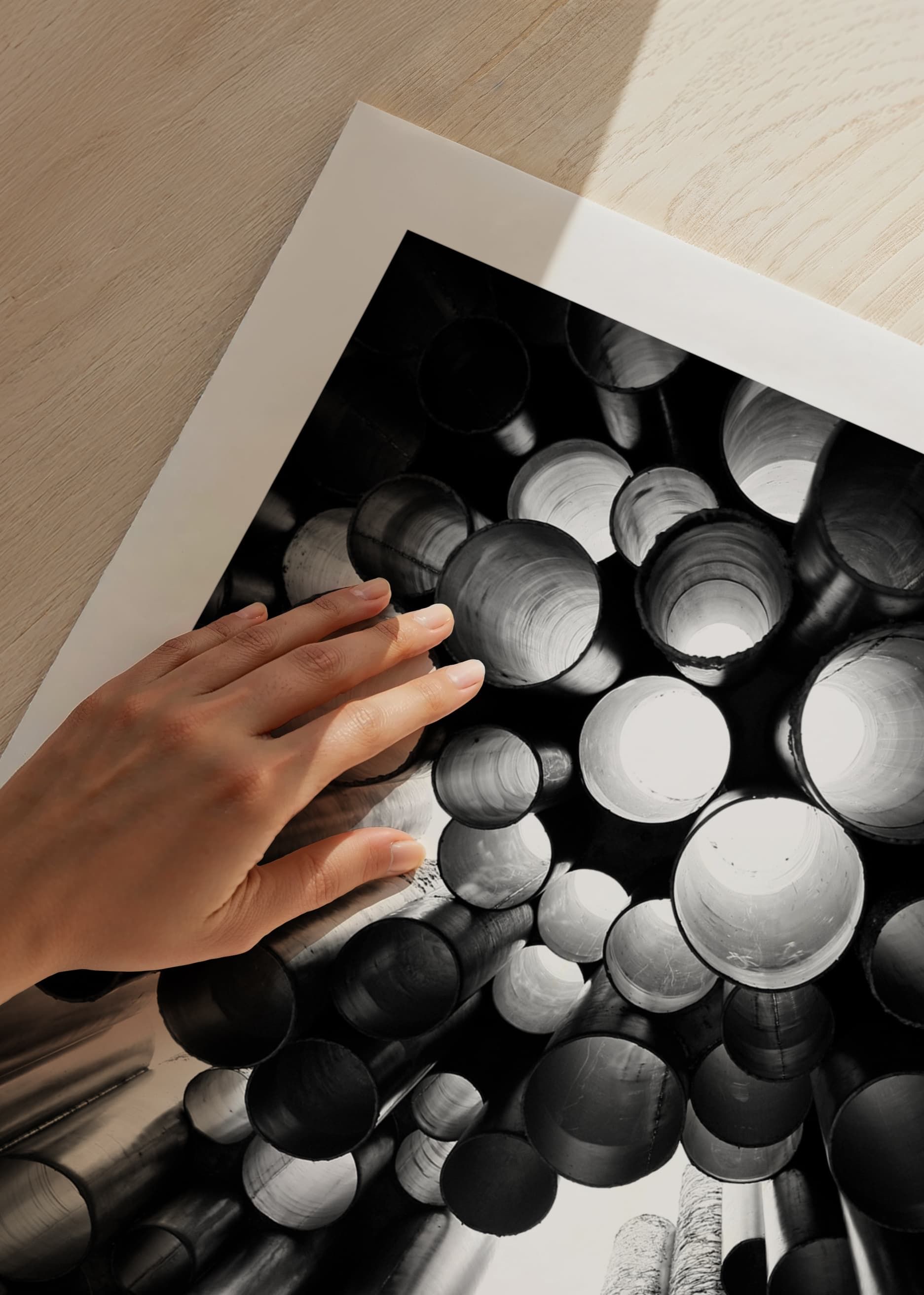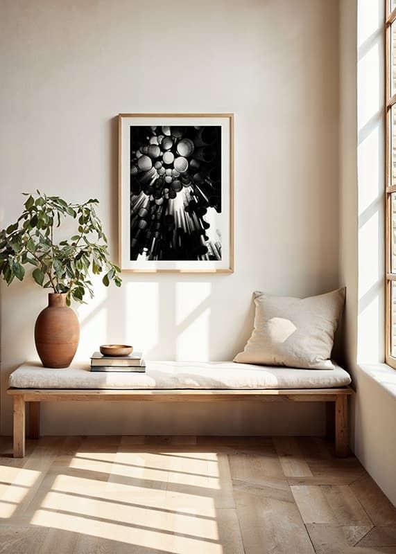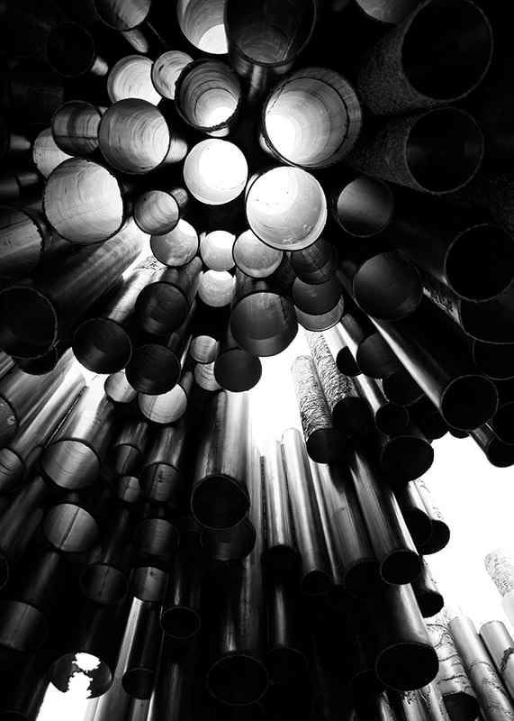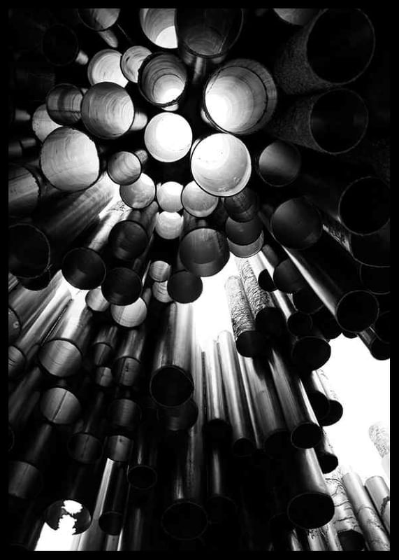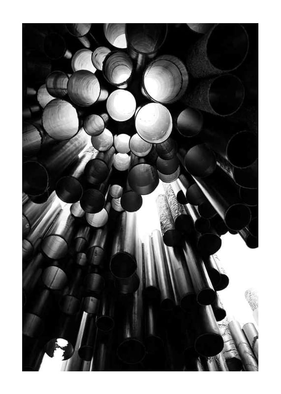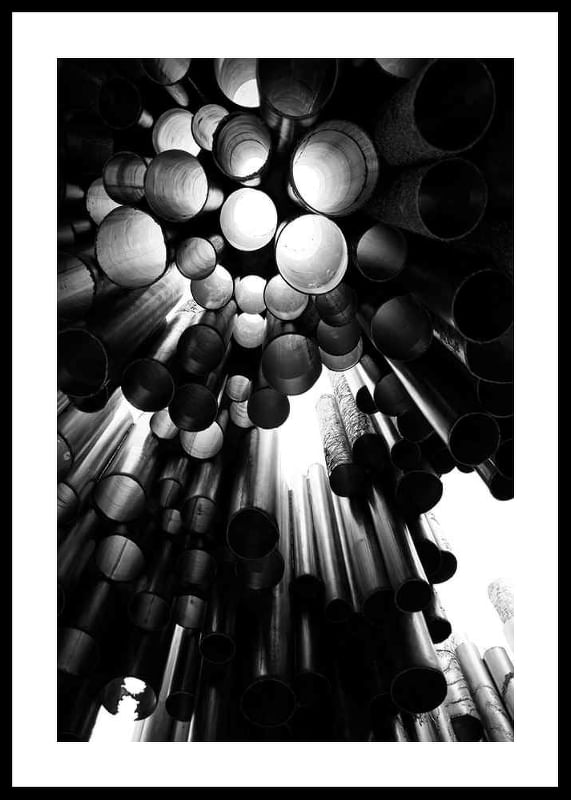 Metallic tubes of various sizes form a dramatic and graphic structure from the Sibelus Monument in Helsinki, Finland. Light filters through the openings and creates exciting contrasts in black and white. This poster gives a modern architectural feel and is suitable for, for example, living rooms, hallways or offices.