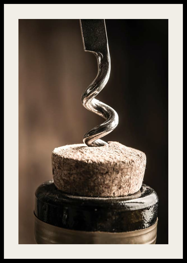 The corkscrew slowly turns into a wine bottle, and the detail captures the texture of the cork and the shine of the metal. Warm brown and golden tones dominate the motif, with a focus on the simple moment before opening the wine. This item brings a stylish feel to the kitchen or dining room.