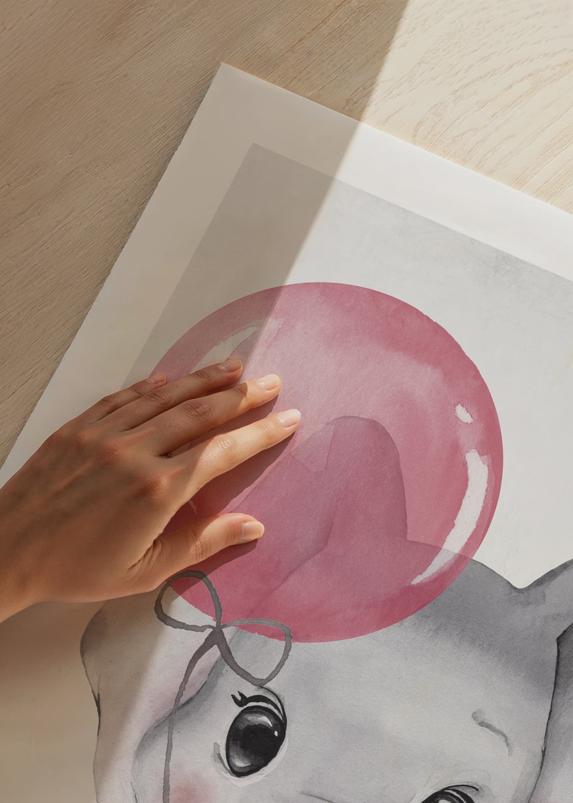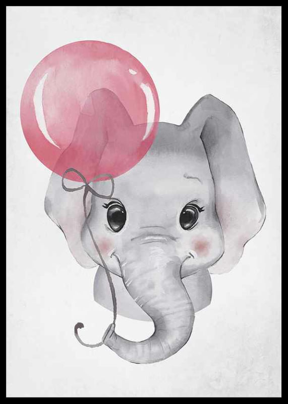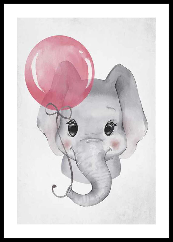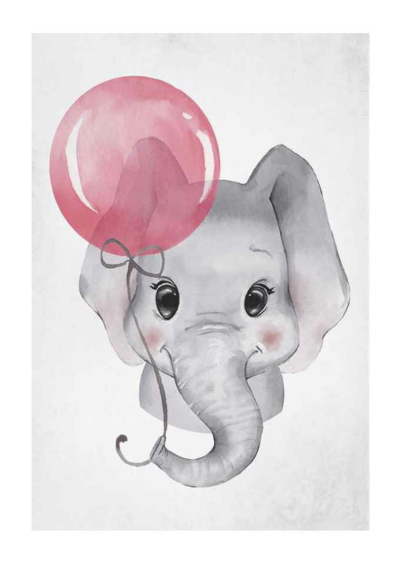 The motif consists of a gray baby elephant holding a pink balloon in its trunk. The large black eyes and soft contours emphasize a friendly feeling. Light background tones allow the elephant to be the focus. This poster adds playfulness to a child's room and works well both alone and together with other motifs.