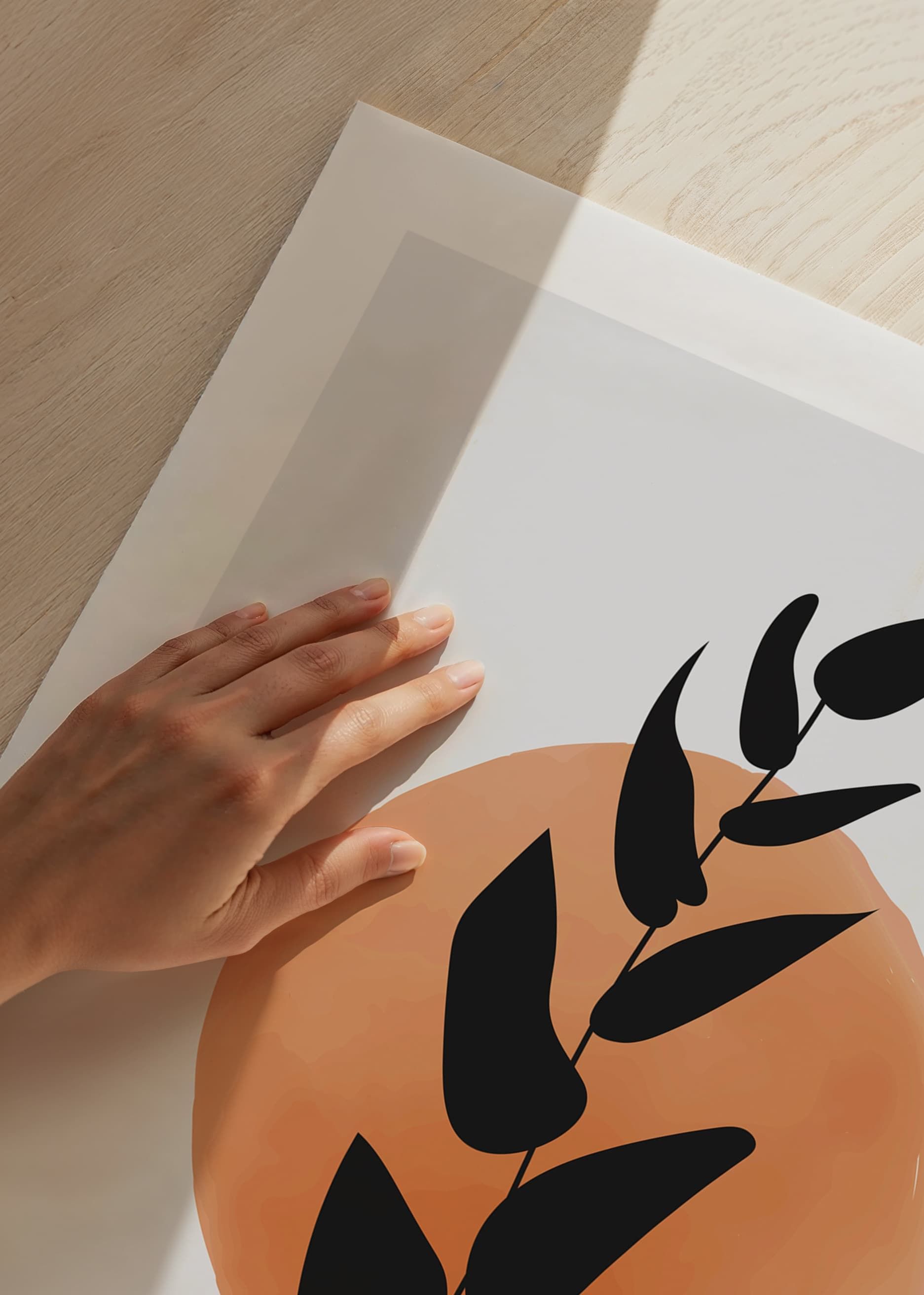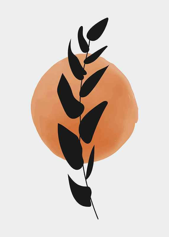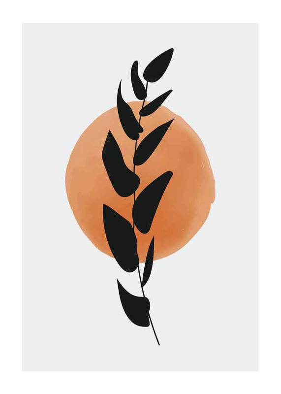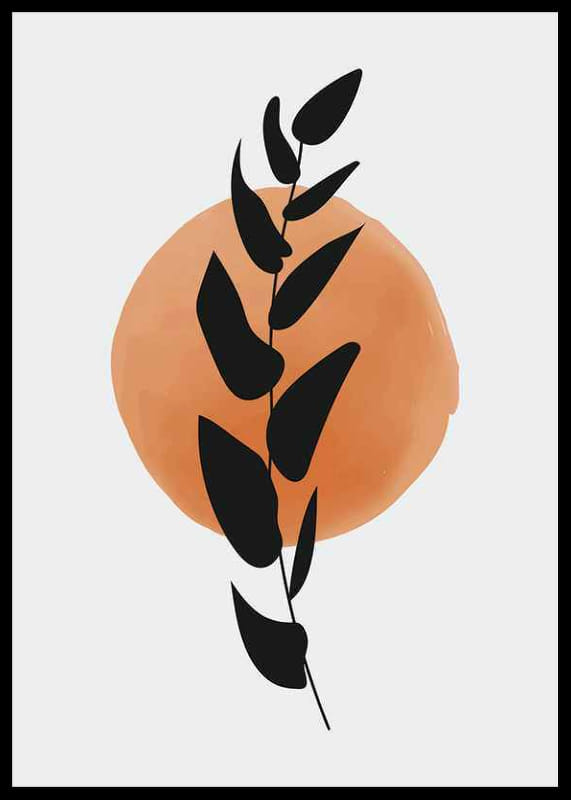 The motif consists of a stylized, black leaf branch placed in front of a softly painted circle in orange watercolor on a light background. The graphic shapes and simple color choices create a modern expression. This poster gives a subtle artistic feel and fits well in both the living room and hallway.