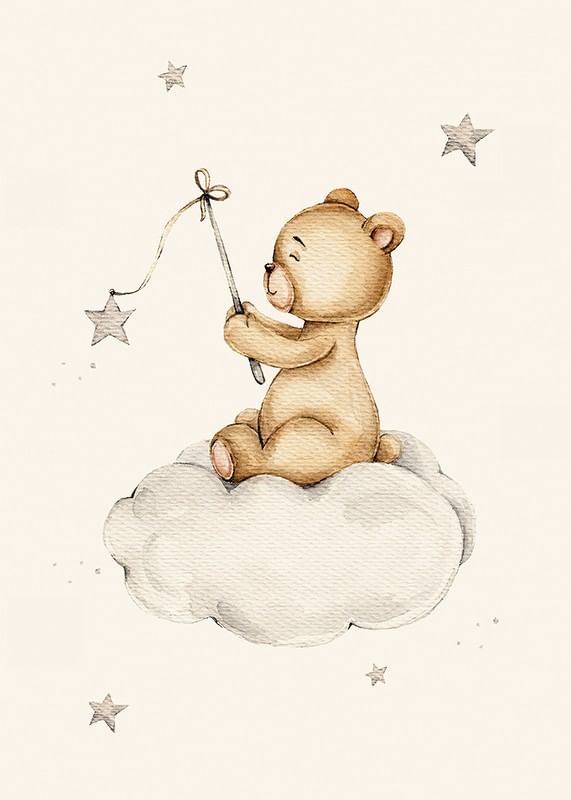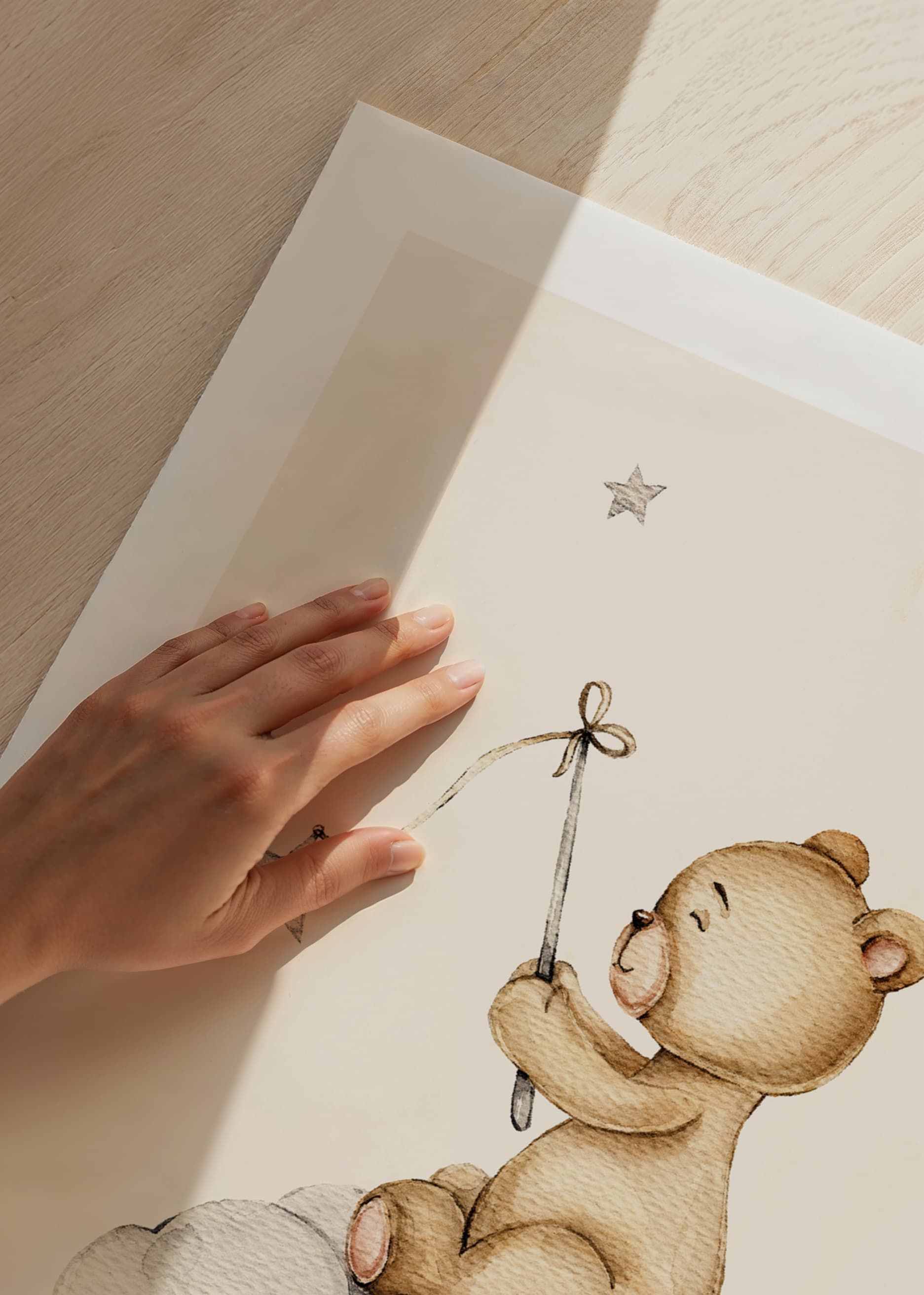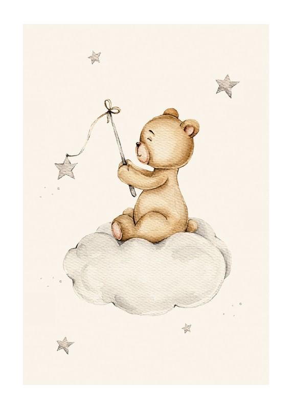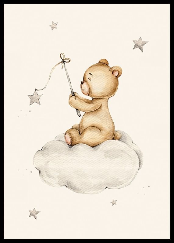 A small teddy bear sits on a soft white cloud and holds a stick with a ribbon and a star. Around the bear, several gray stars float against a light sand-colored background. This poster in soft brown, gray and blue tones fits nicely in children's rooms and contributes to a calm and friendly atmosphere.