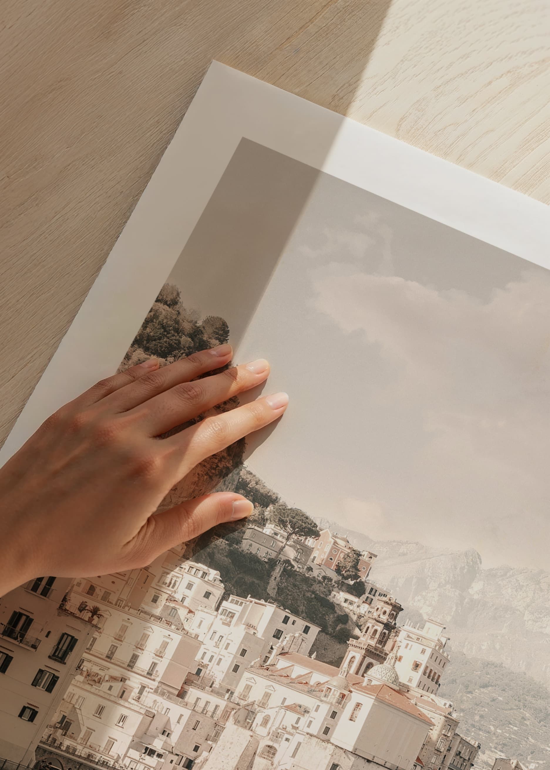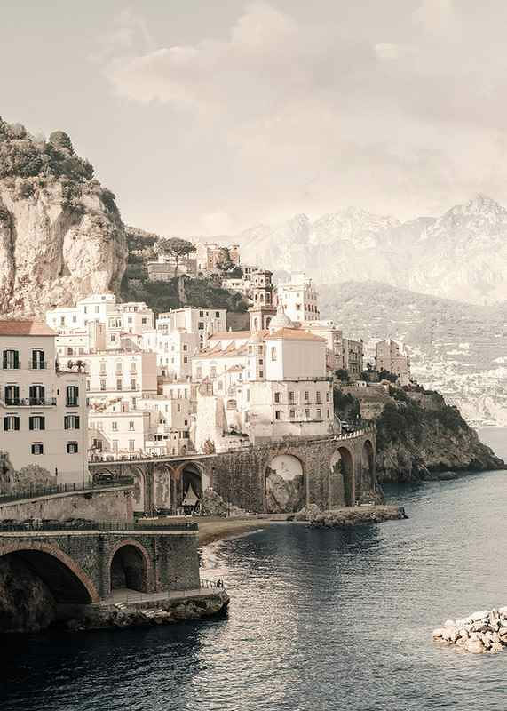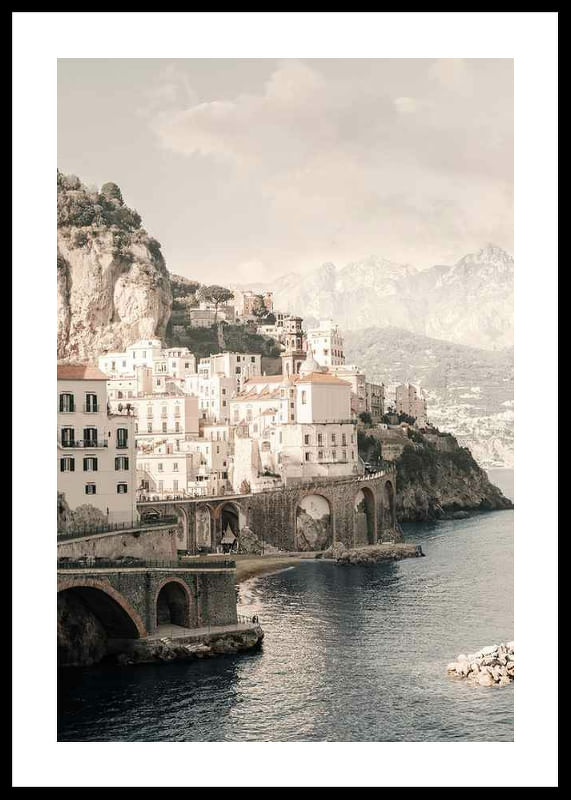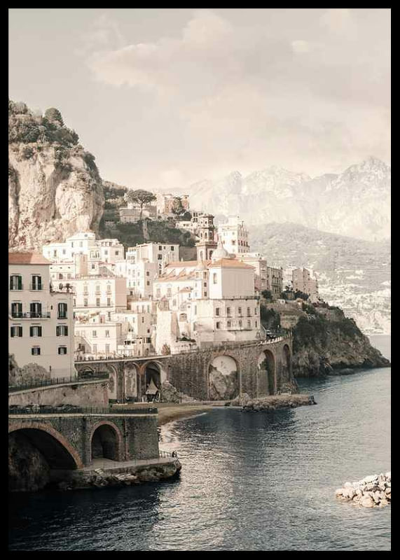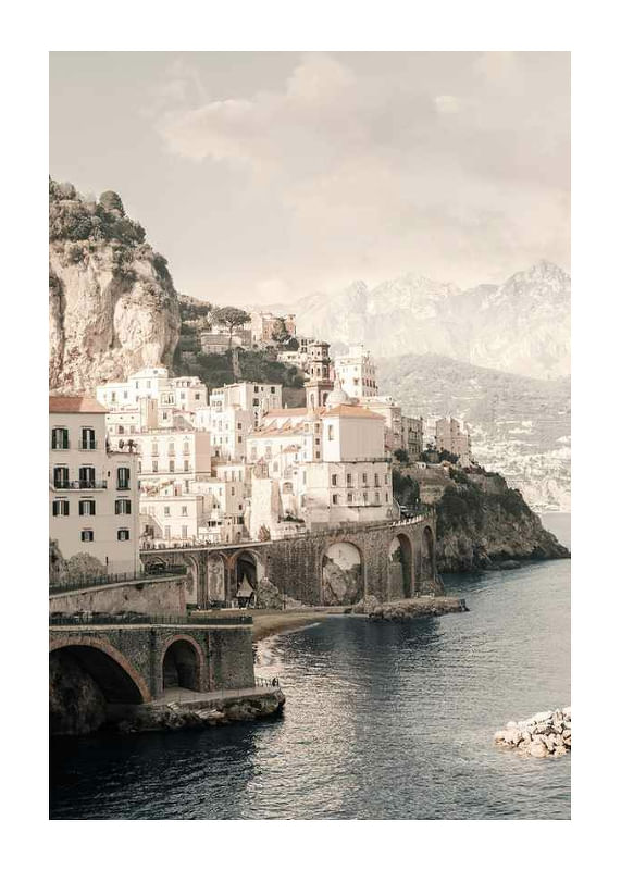 Brightly photographed coastal scene of the Amalfi Coast in southern Italy with pastel-colored houses climbing dramatic cliffs. Details of arched bridges, calm blue sea and soft mountains in the background give this poster a summery and airy feel. Suitable for homes with a southern European atmosphere.