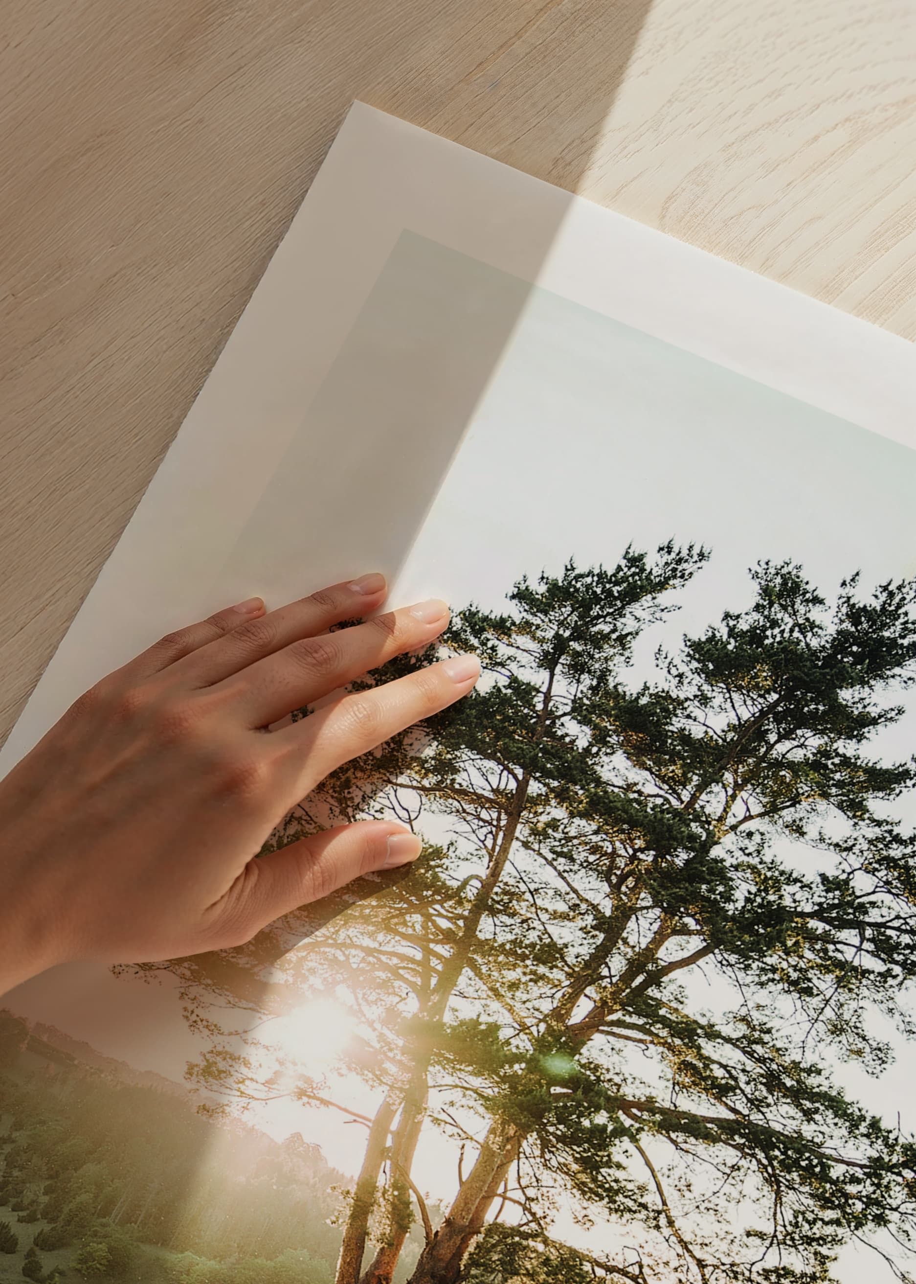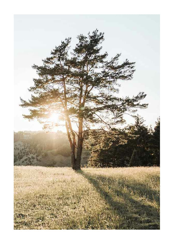 A sunlit tree stands in the middle of an open meadow with low grass, surrounded by forested hills in the background. The morning sun creates a warm backlight and long shadows across the landscape. The light and sober color palette makes the poster easy to place in, for example, a living room, kitchen or hallway for a natural feel.