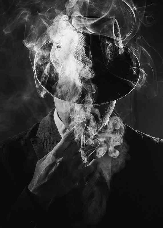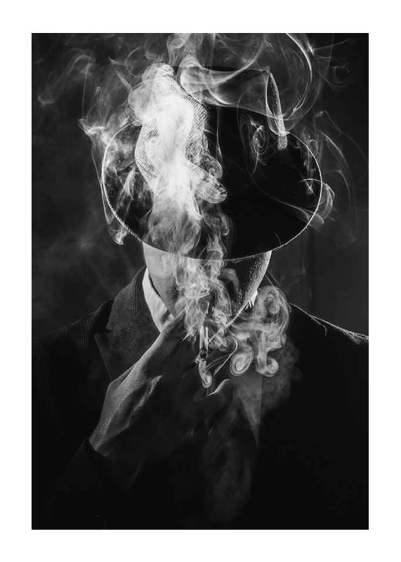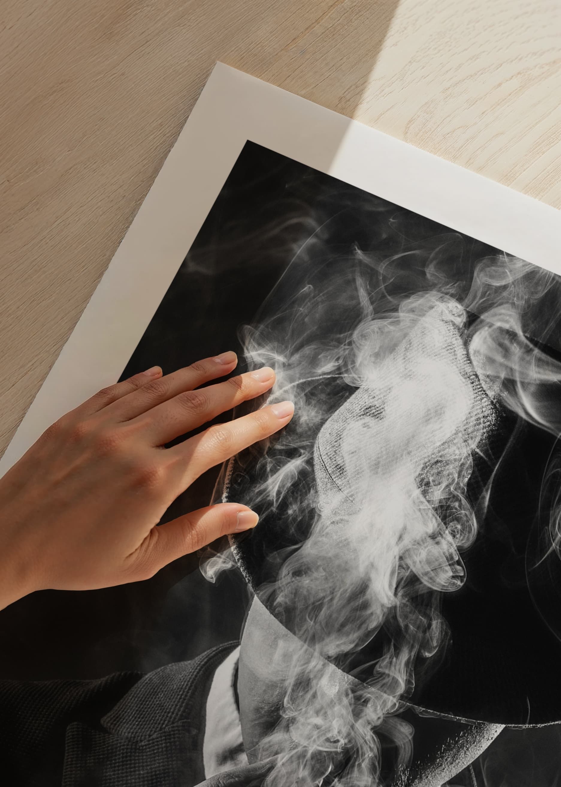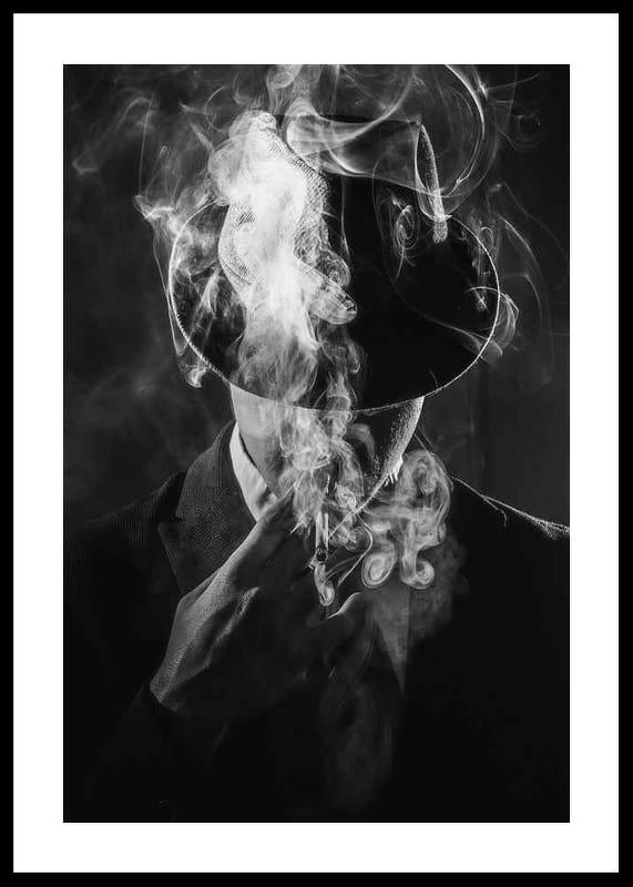 A man wearing a dark suit and hat stands with his face partially hidden by thick clouds of smoke from a cigarette. The swirling smoke creates interesting contrasts against the dark background and gives the motif a timeless feel. This poster fits perfectly in a lounge, office or room with vintage-inspired decor.
