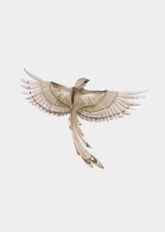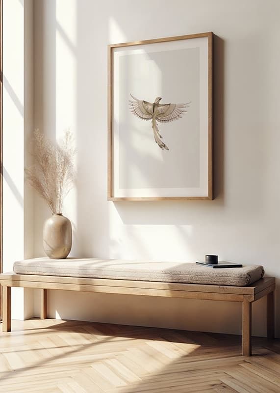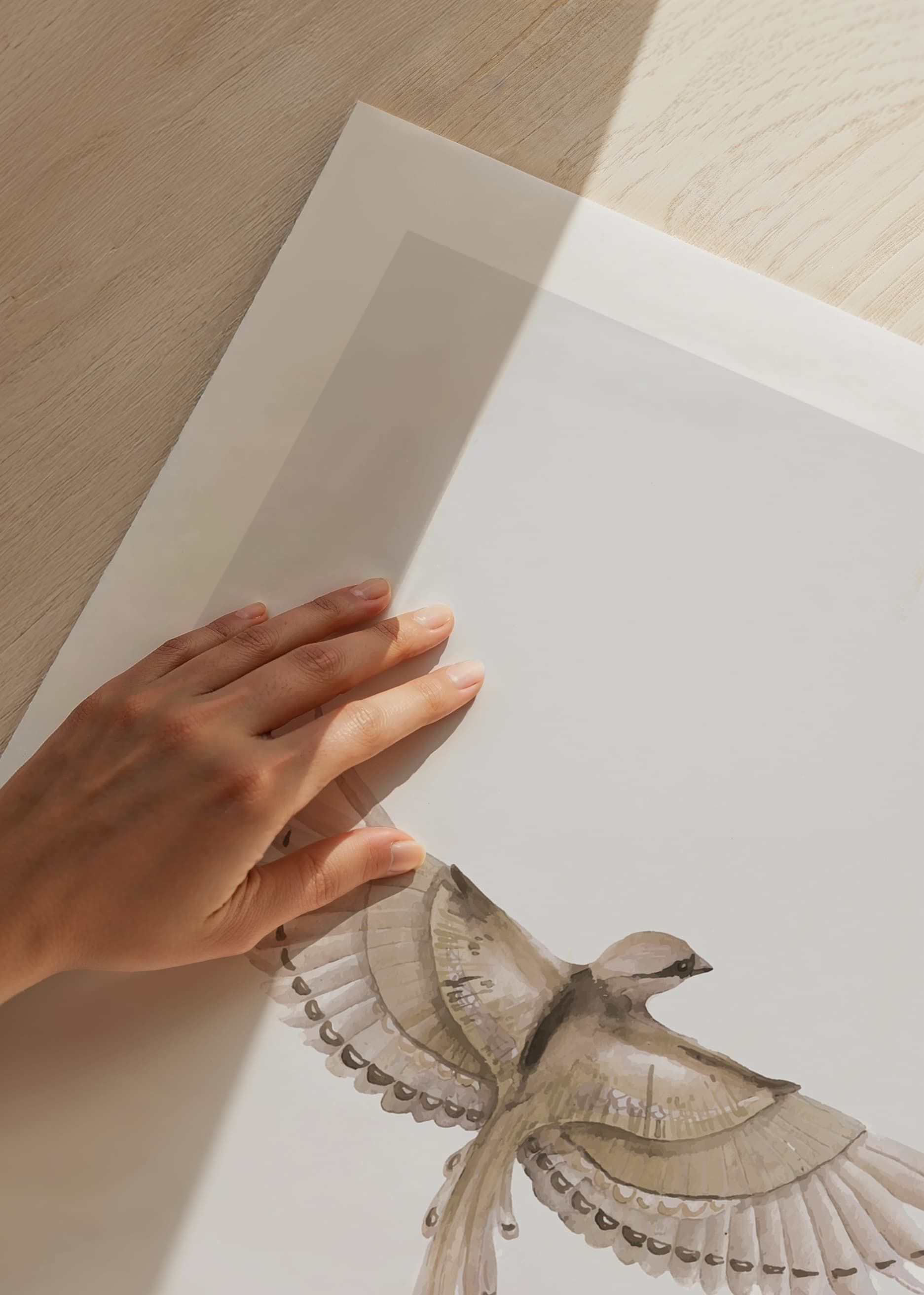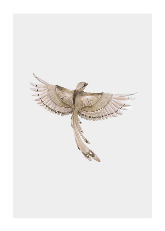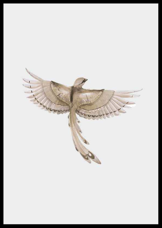 A light brown bird depicted in flight with its wings spread wide and its long, elegant tail. Thin brushstrokes highlight the details of the plumage against a white background, giving the motif a light and understated feel. The poster fits discreetly into everything from living rooms to study rooms and combines nicely with other nature motifs.