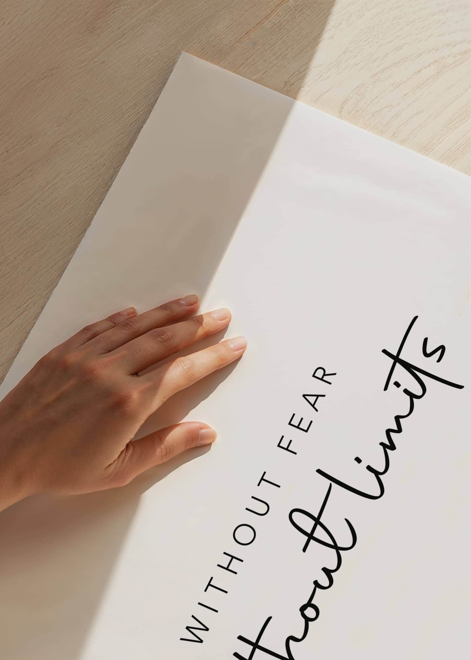The motif consists of the inspiring text 'Dream without fear, love without limits' in black against a white background. The combination of stylish uppercase text and soft writing style gives a modern feel. This poster fits well in, for example, bedrooms, hallways or offices and contributes a positive message to the room.