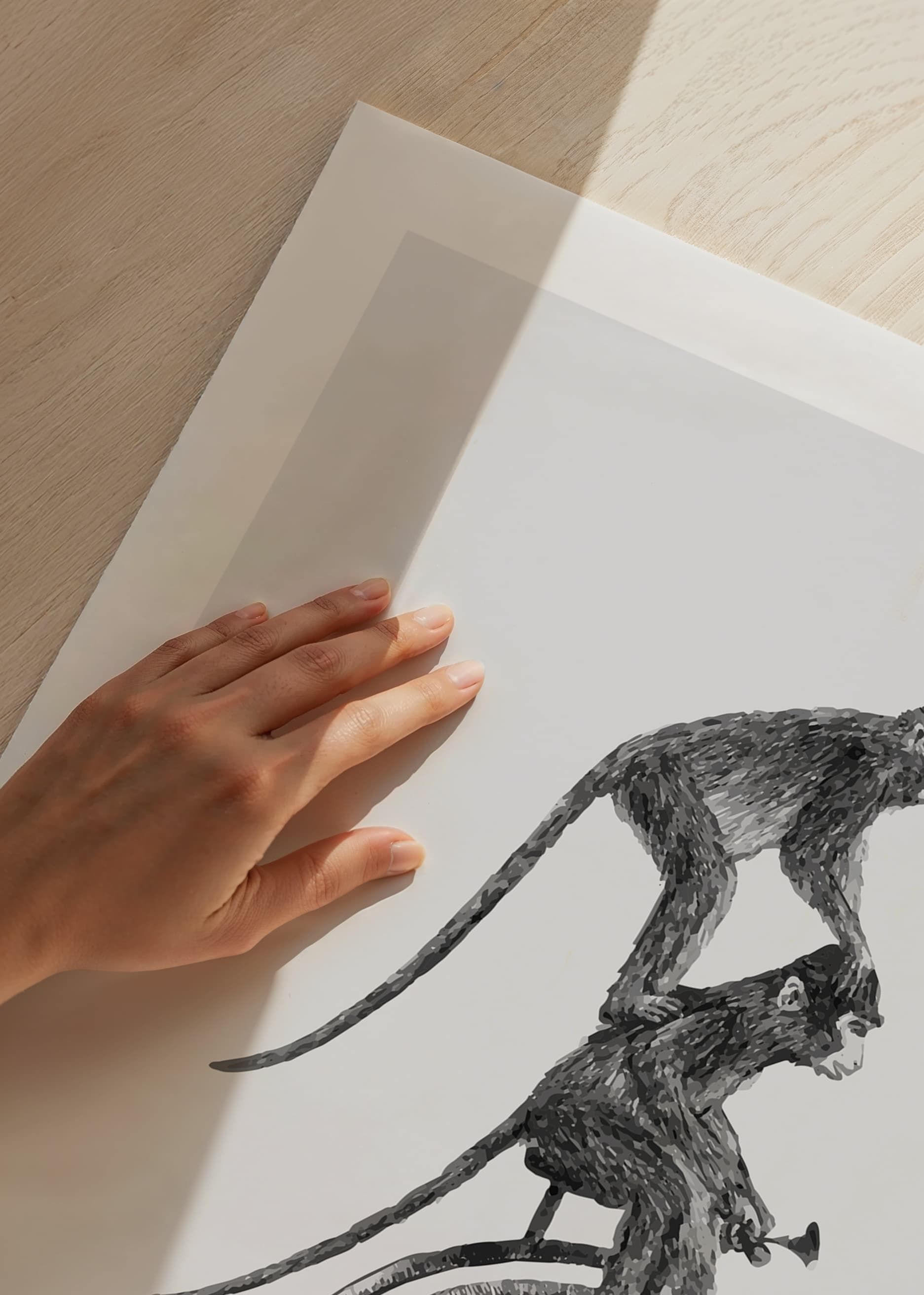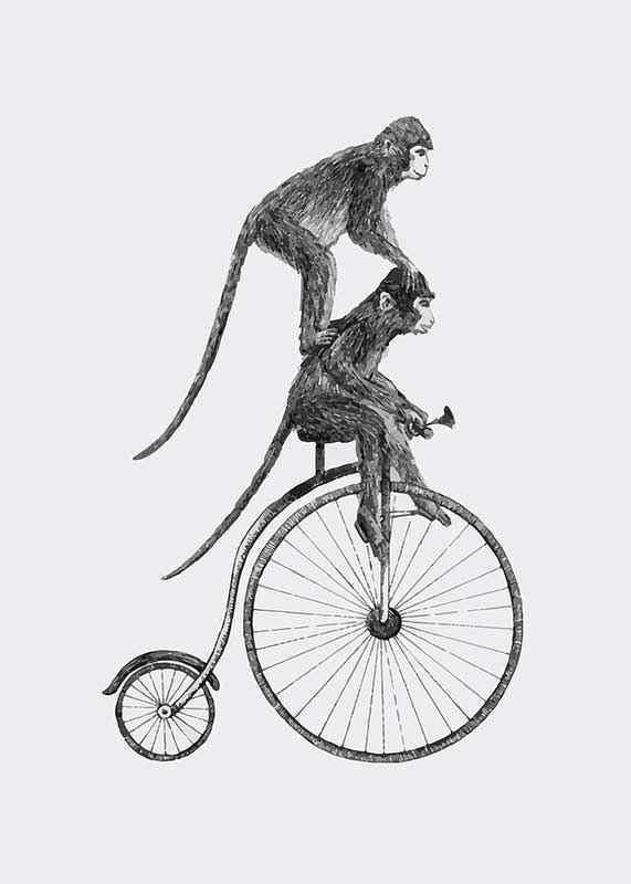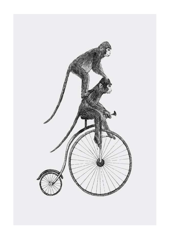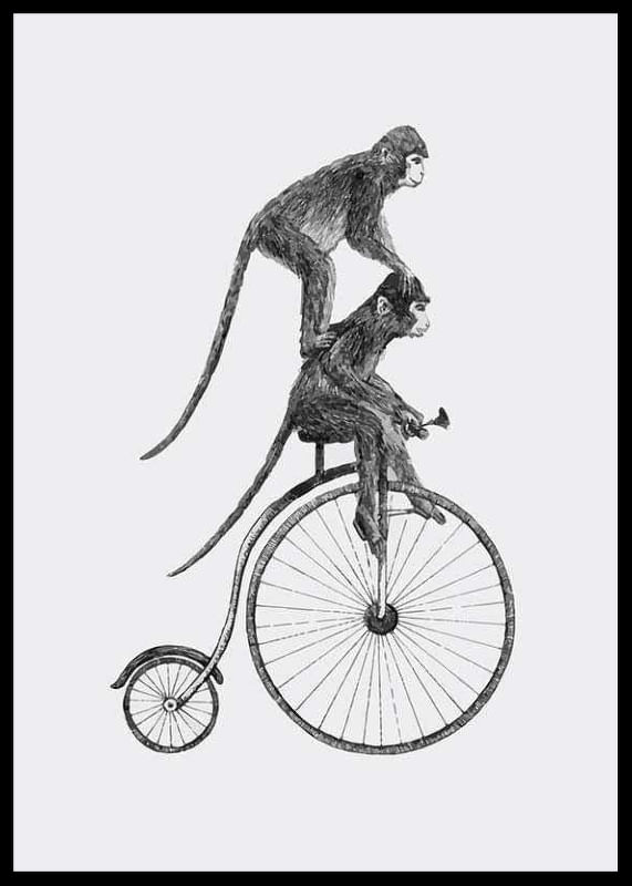 Two monkeys appear in black and white cartoon style, one sitting on a large old-fashioned high-wheeler while the other balances on top of his shoulders. The light gray, simple background highlights the graphic expression of the motif. A playful poster that fits in a child's room or as a contrast in modern environments, and adds an imaginative element to the room.