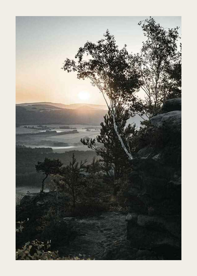 A view of a Swiss autumn landscape with silhouettes of slender trees in the foreground and mist-shrouded mountains and lakes in the backlight. The morning sun rises over the horizon, casting a soft, warm tone over the valleys. This poster gives the room a peaceful atmosphere and fits nicely in a bedroom or living room with a natural interior.