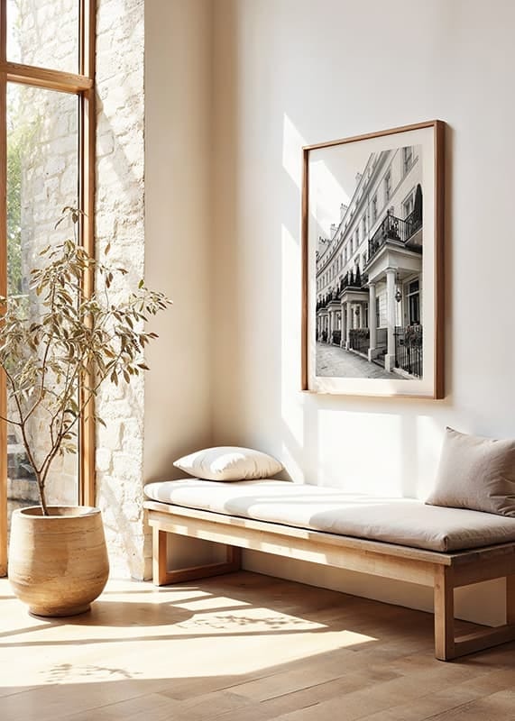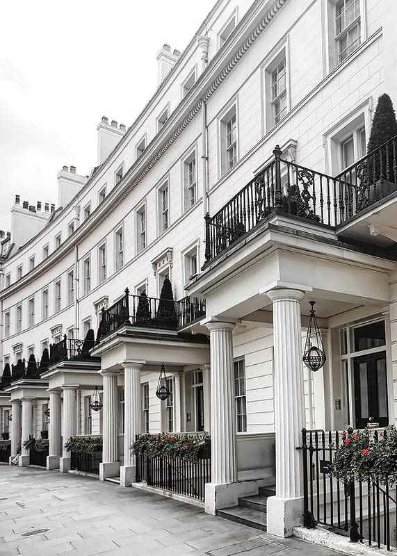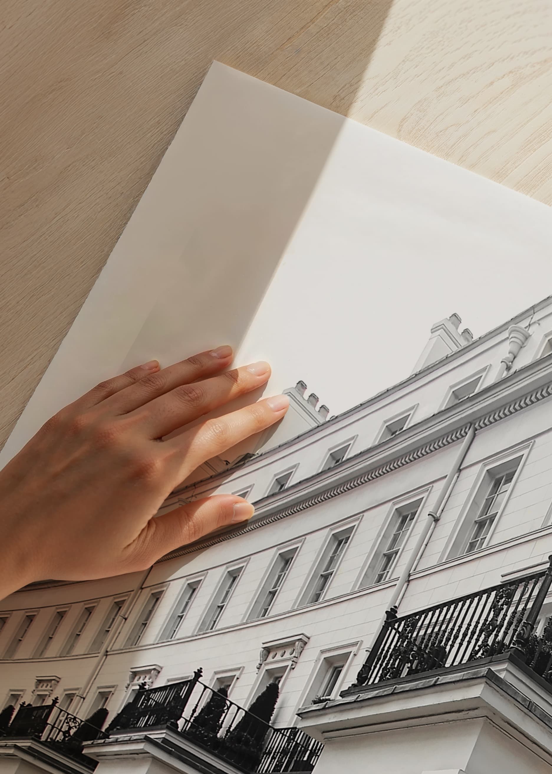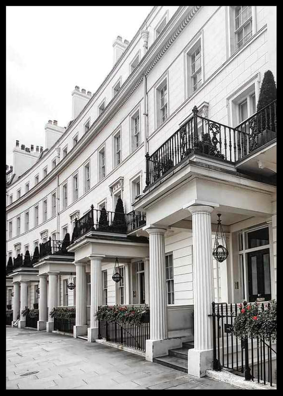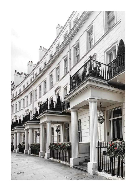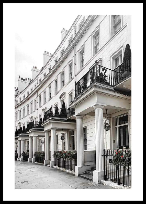 White Georgian facades with tall windows, black wrought iron balconies and classical columns adorn a well-kept row of houses in the Belgravia district, one of London's most exclusive residential areas. Flower boxes and ball-shaped shrubs add subtle greenery along the sidewalk. This poster adds a timeless architectural feel to your home, especially in a living room or hallway.
