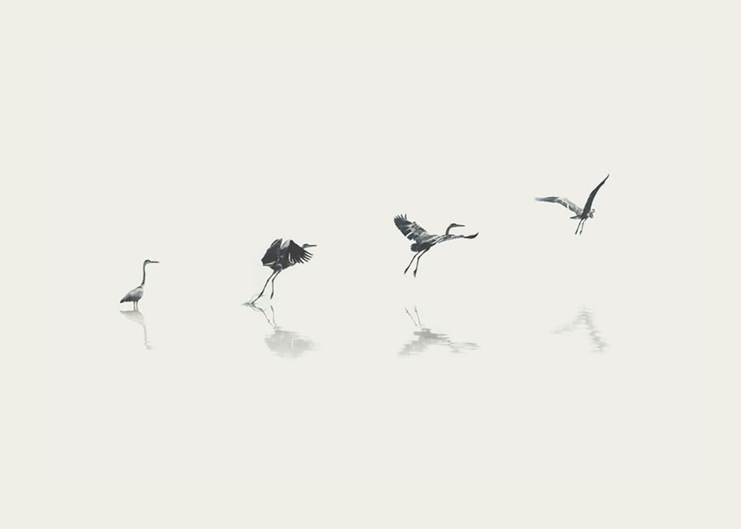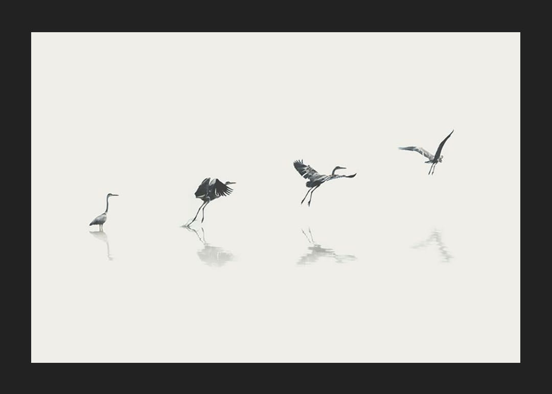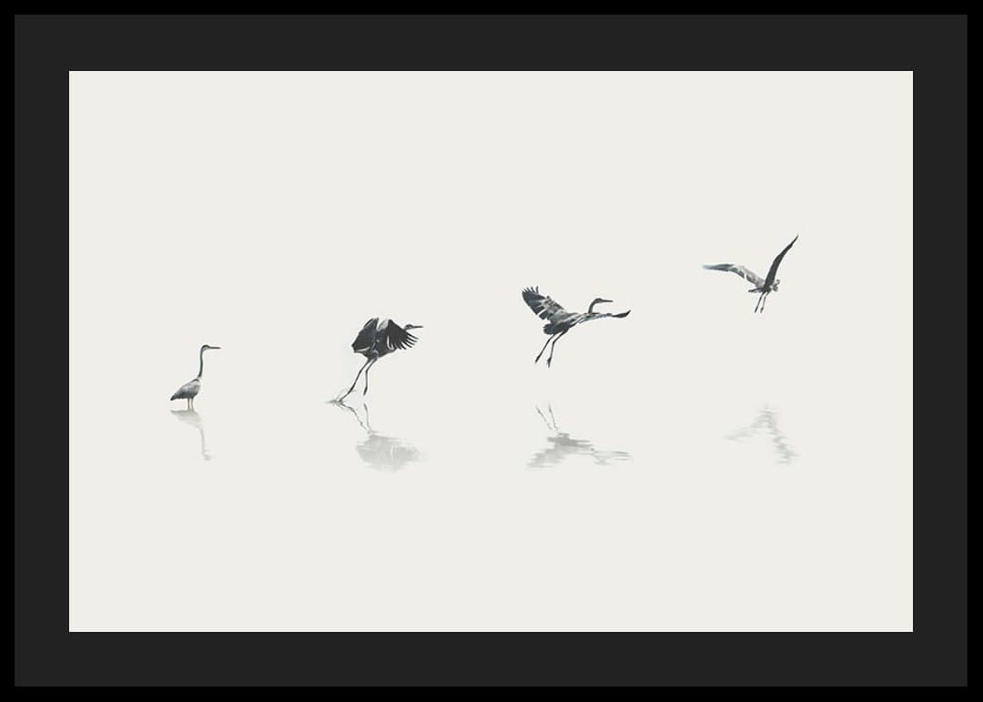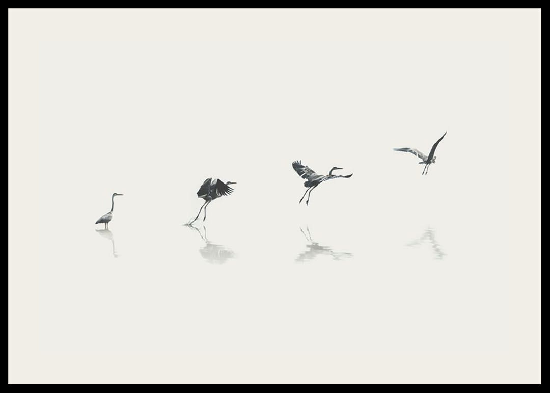 Four stages of a bird rising from the water's surface in a stylized, minimalist illustration. Grey and black silhouettes against a light sand-colored background create an airy impression. The steps of the movement are subtly reflected in the water. This poster fits well in both modern homes and rooms with natural elements.