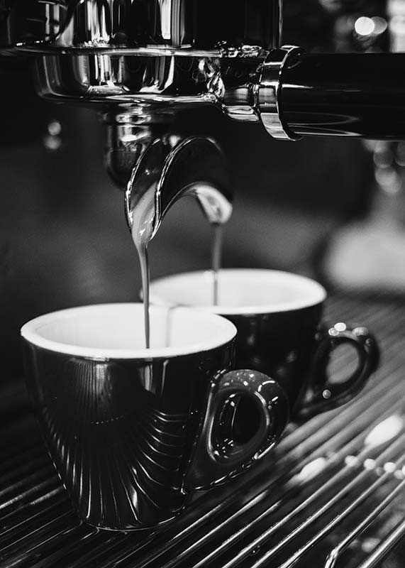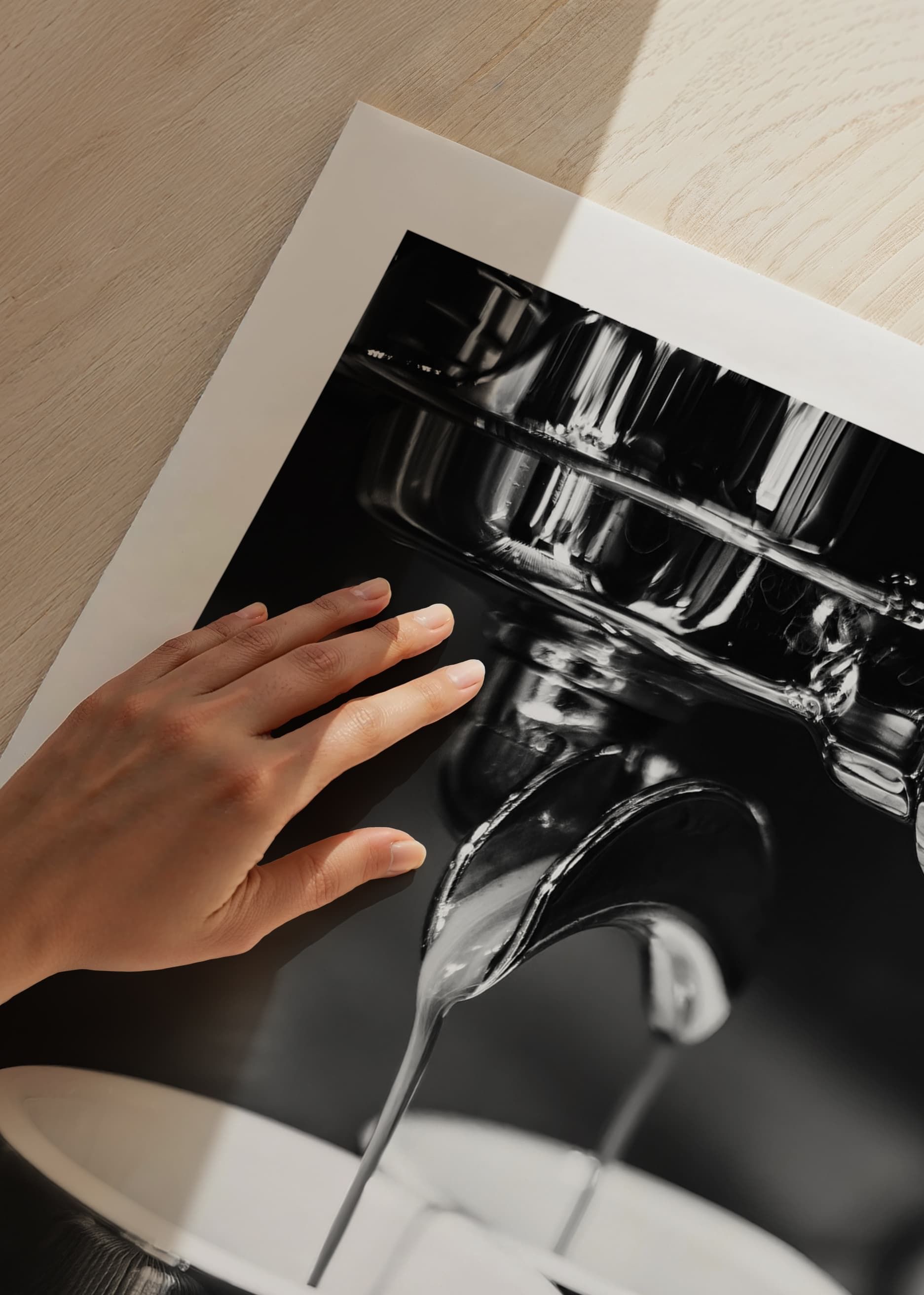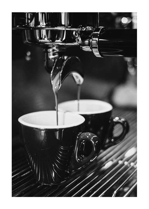 Two dark espresso cups stand under a metallic espresso machine while freshly brewed coffee flows into the cups. The contrast between the shiny steel and the deep shadows creates a classic expression. This poster is particularly suitable for kitchens or café-inspired environments and reinforces the feeling of genuine coffee culture.