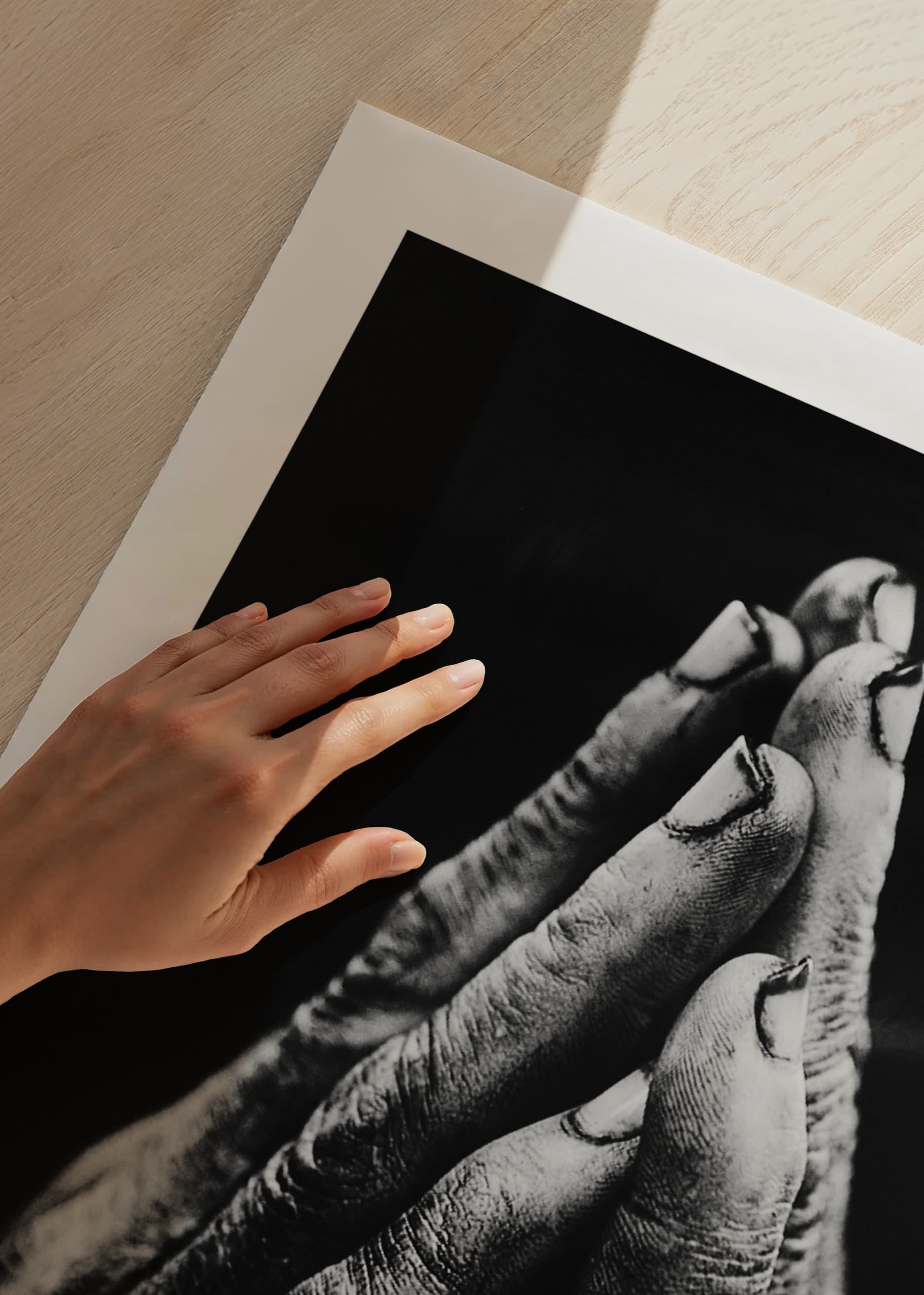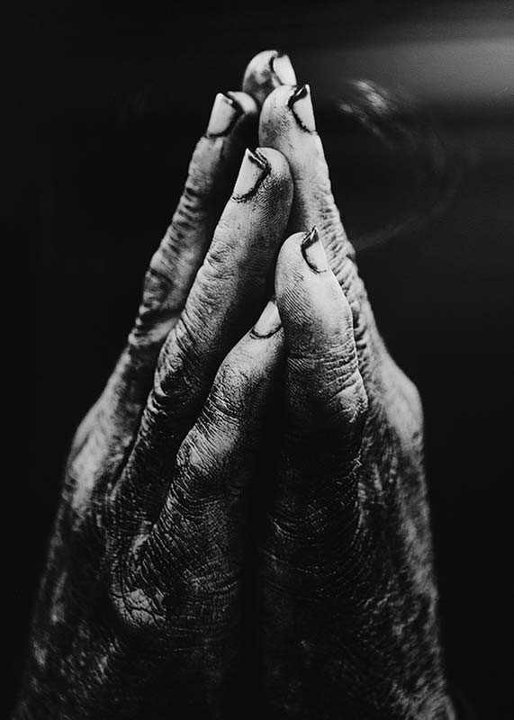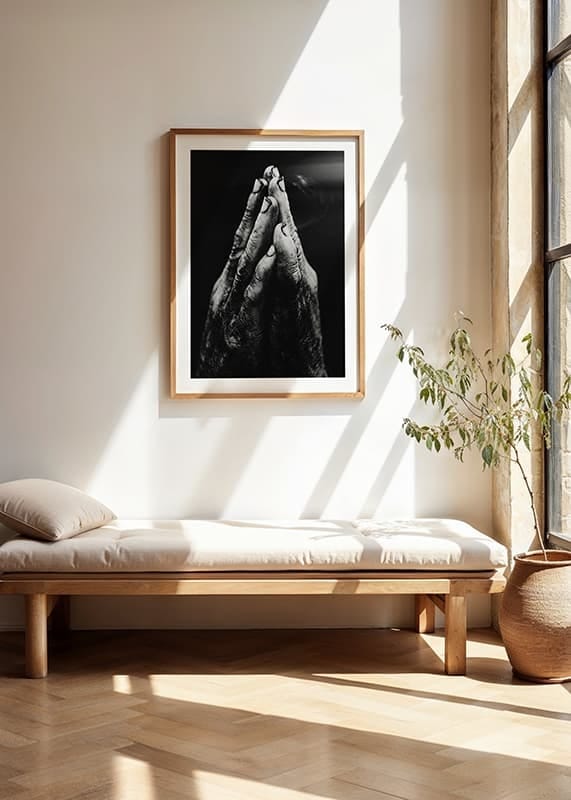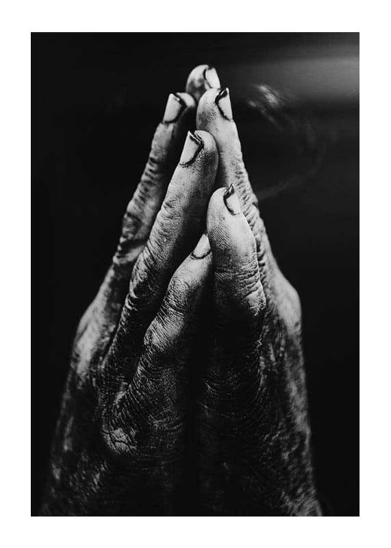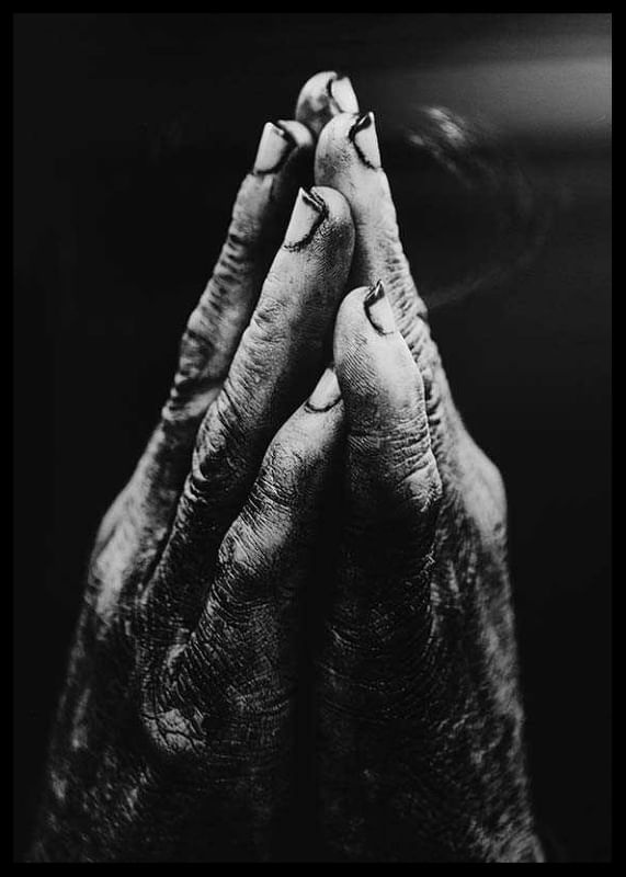 A close-up of two hands with rough skin and dirty nails held together in a gesture of prayer or supplication. The dramatic contrasts between light and shadow highlight the hand's structure and life experience. This black and white poster is suitable for rooms where an honest and powerful expression is desired.