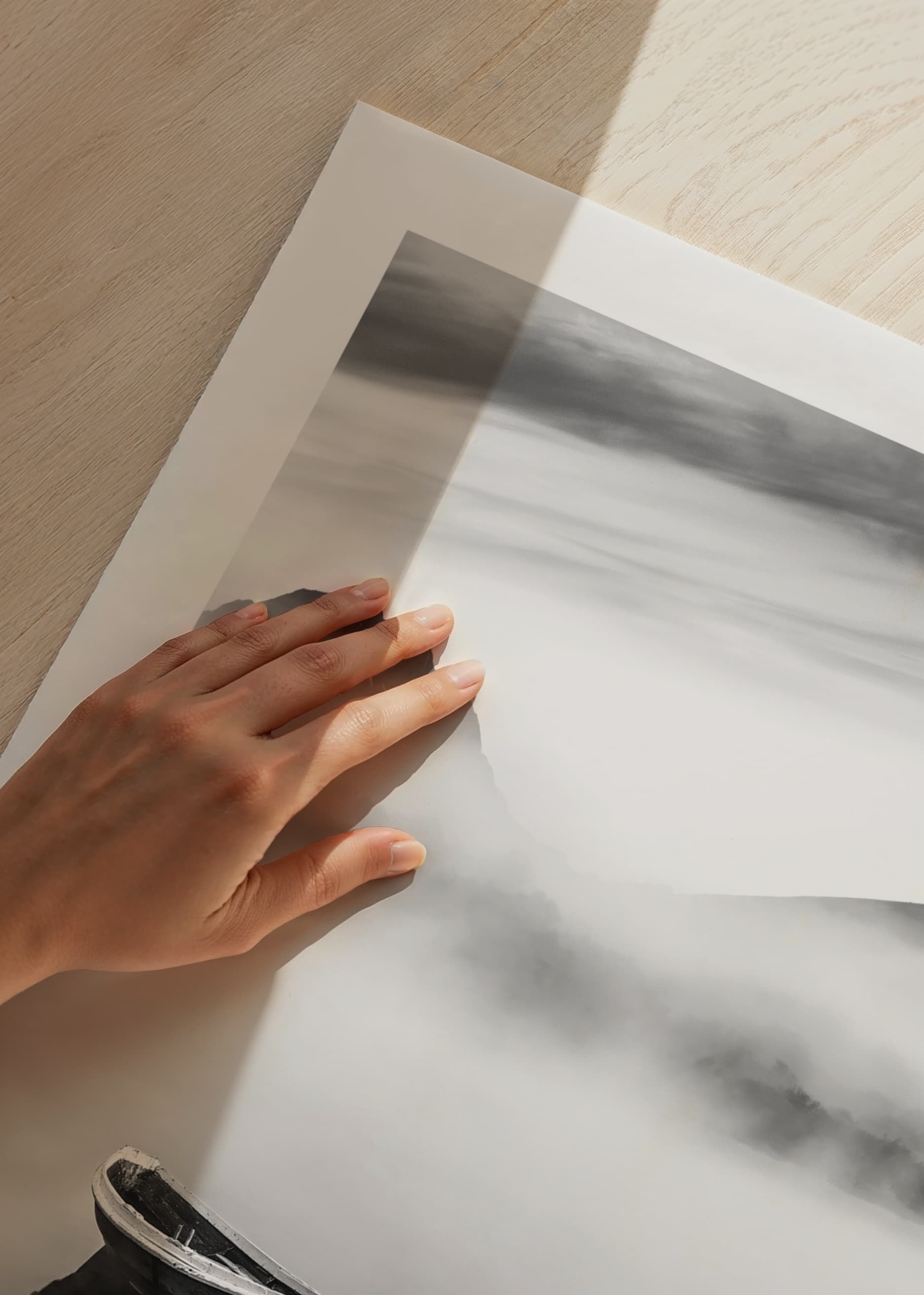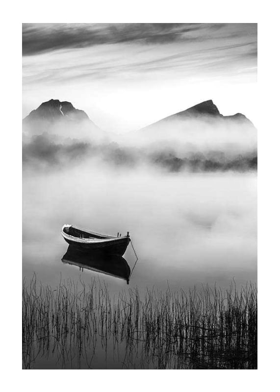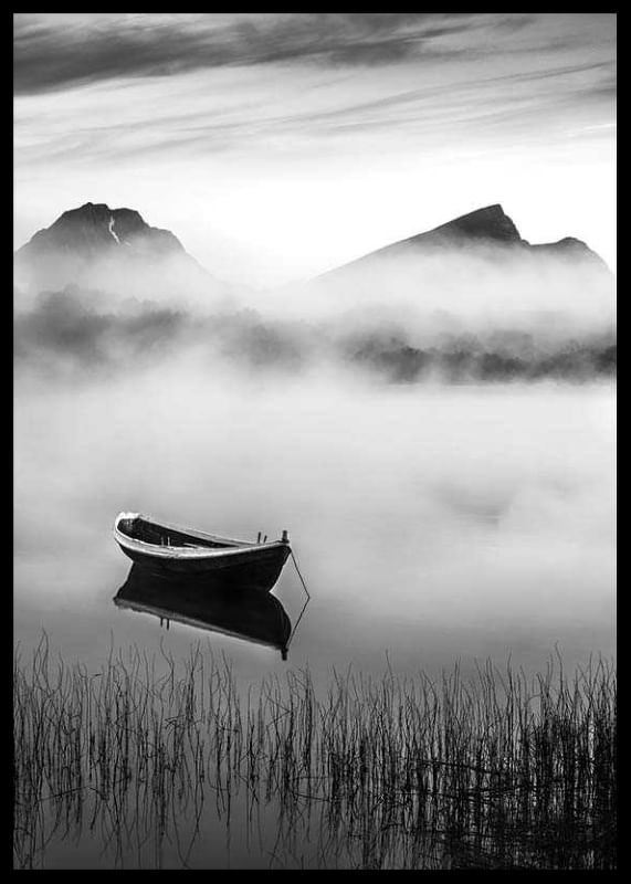 A lonely anchored rowboat is seen on a mirror-like lake surrounded by dense fog. Mountain peaks rise in the background and shiny water surfaces reflect the shape of the boat. Thin reeds in the foreground give depth and contrast to the black and white motif. The poster adds a cool and calm expression to, for example, a living room or hallway.