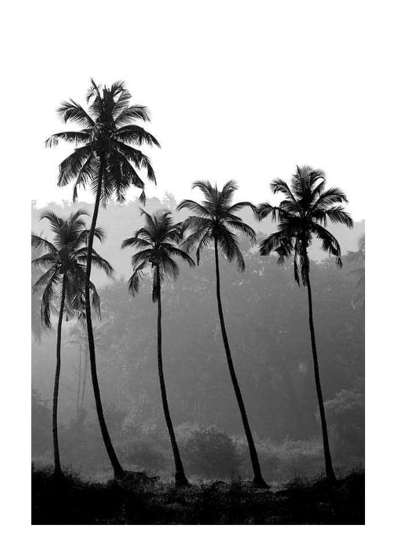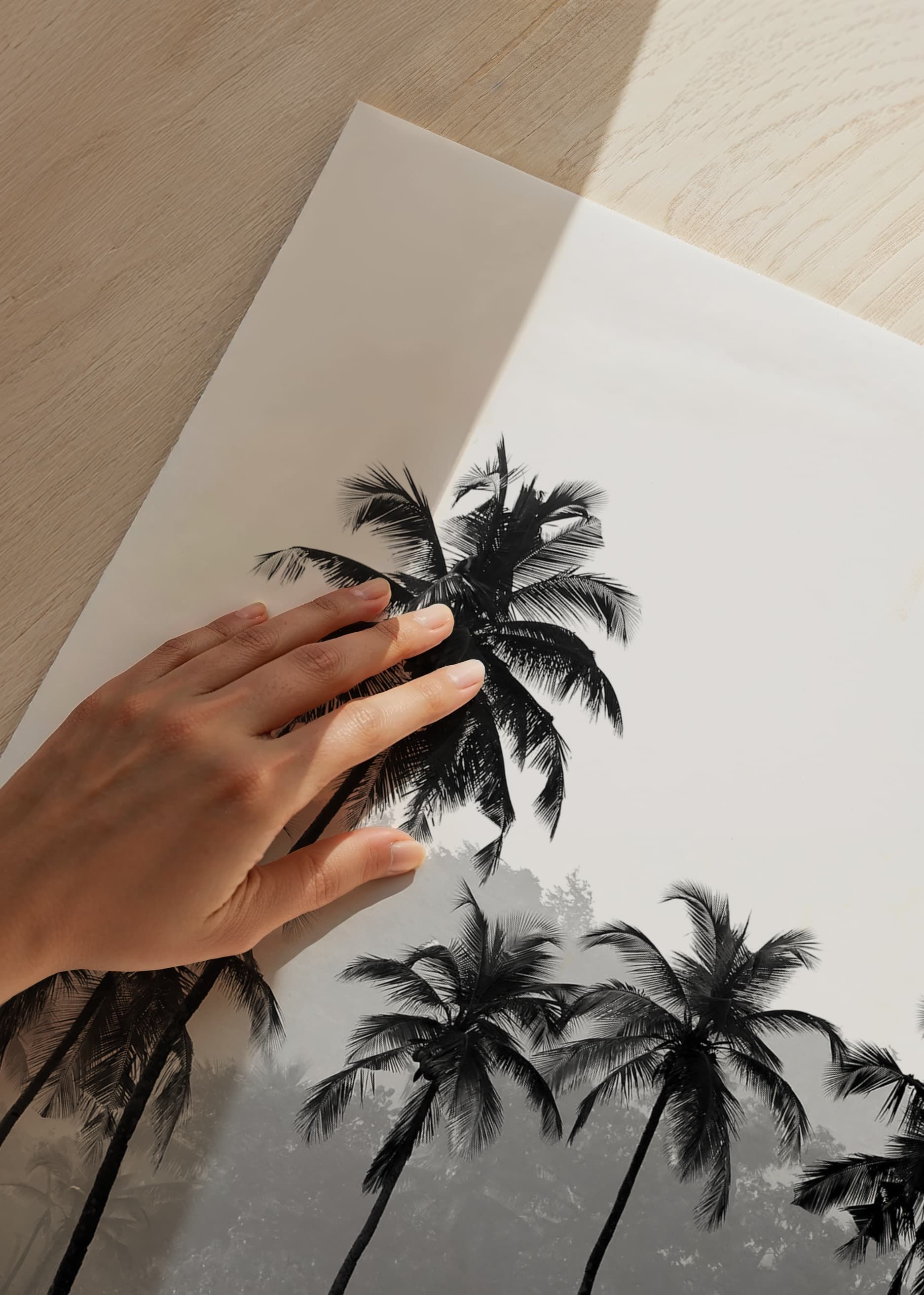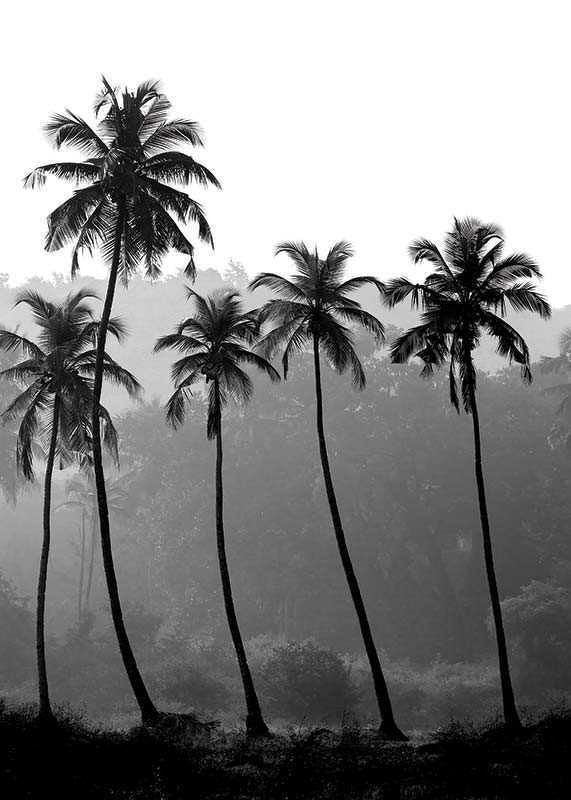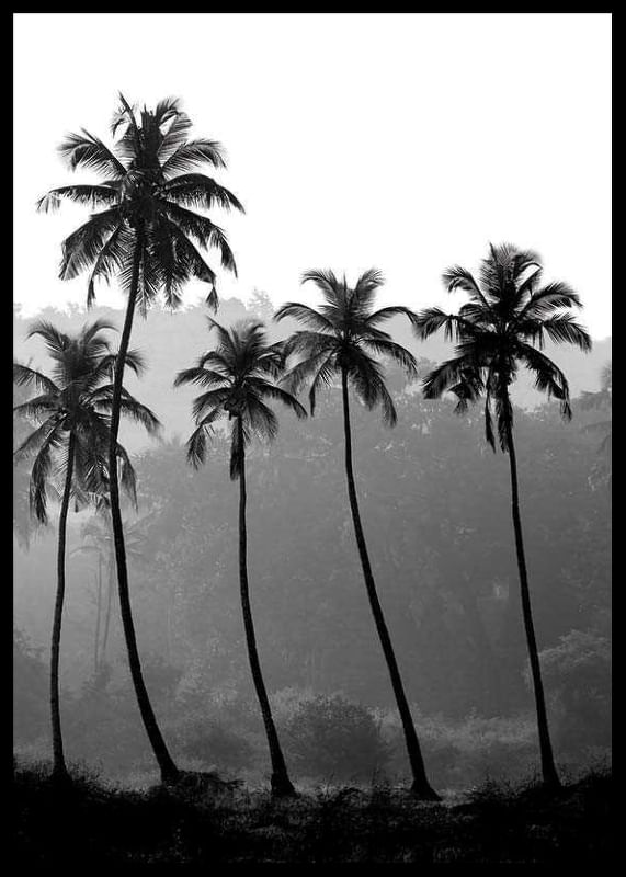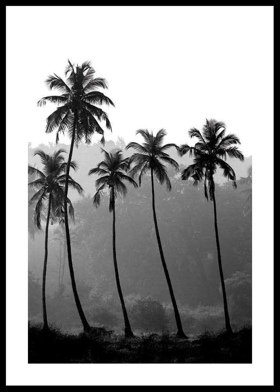 Silhouettes of slender palm trees rise against a light, hazy sky where the background disappears into soft fog. The contrast between the dark trunks and the light sky creates a clear graphic effect. The style is stripped-down and timeless, making this poster easy to combine with other nature motifs in modern homes.