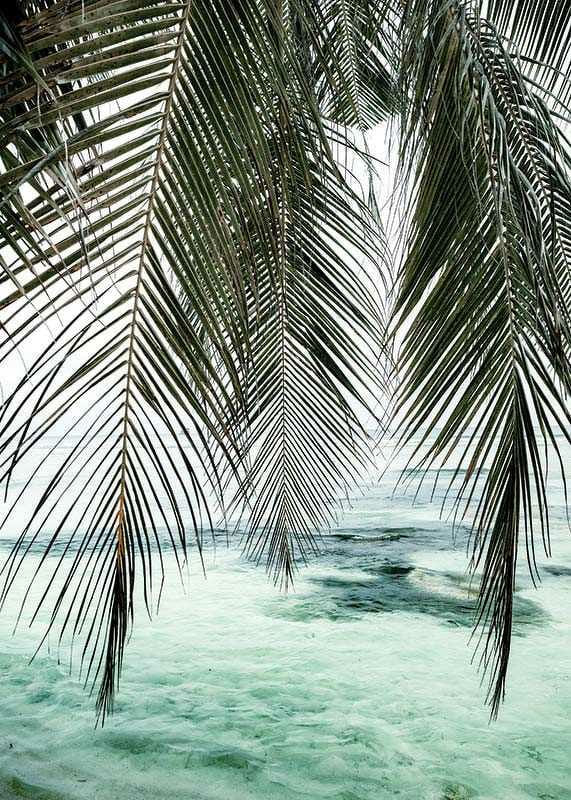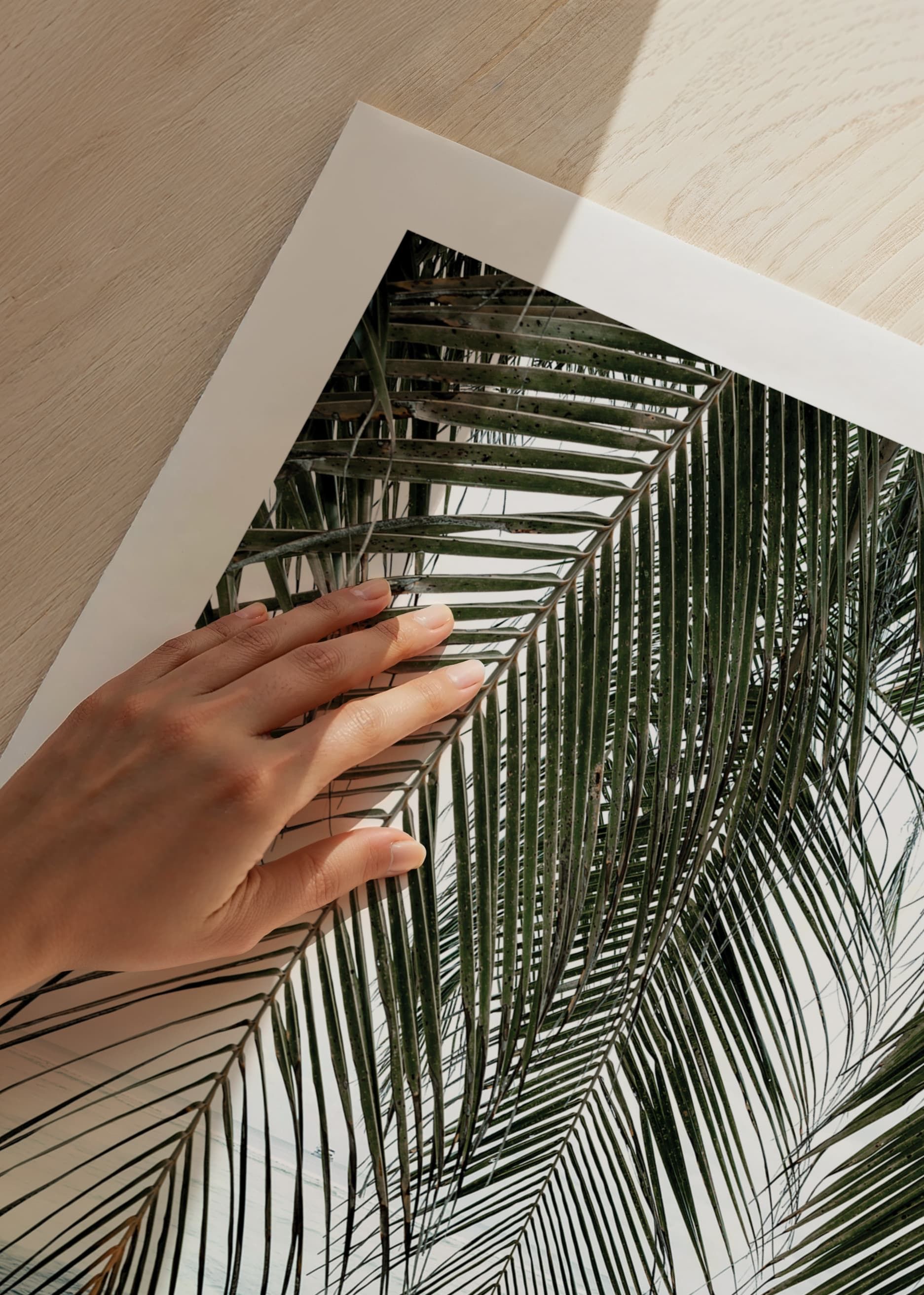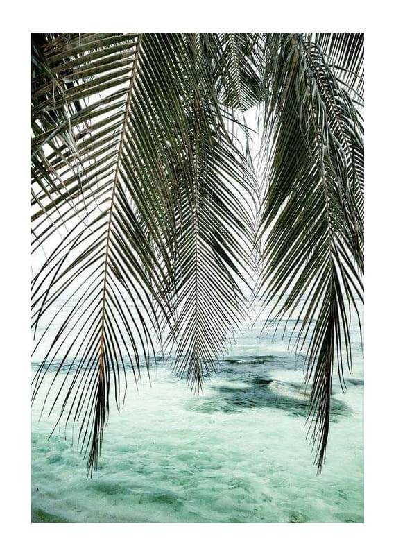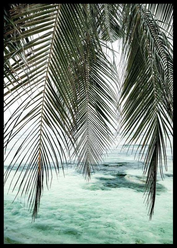 Long palm fronds spread out in the foreground, letting light through to a clear turquoise sea below. The water shimmers in various blue-green tones while the palm tree's shadows create a graphic pattern. This poster conveys a summery, airy feel and is suitable for bright rooms where you want to enhance a relaxed atmosphere.