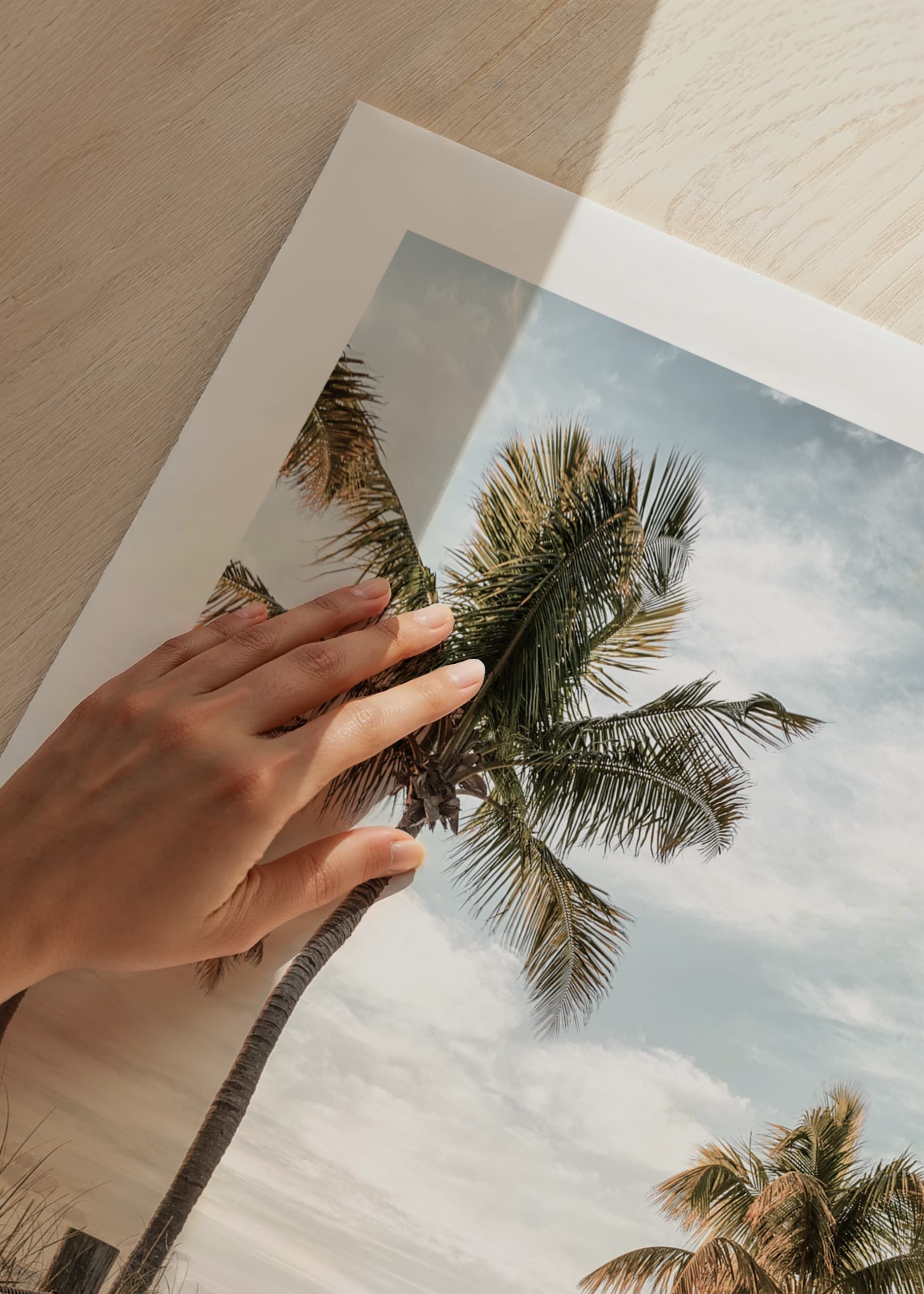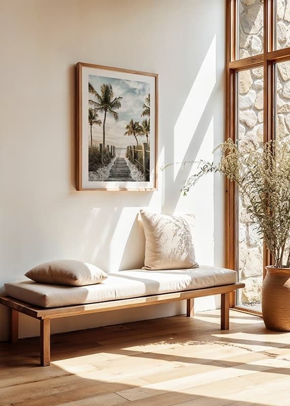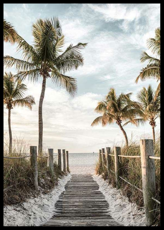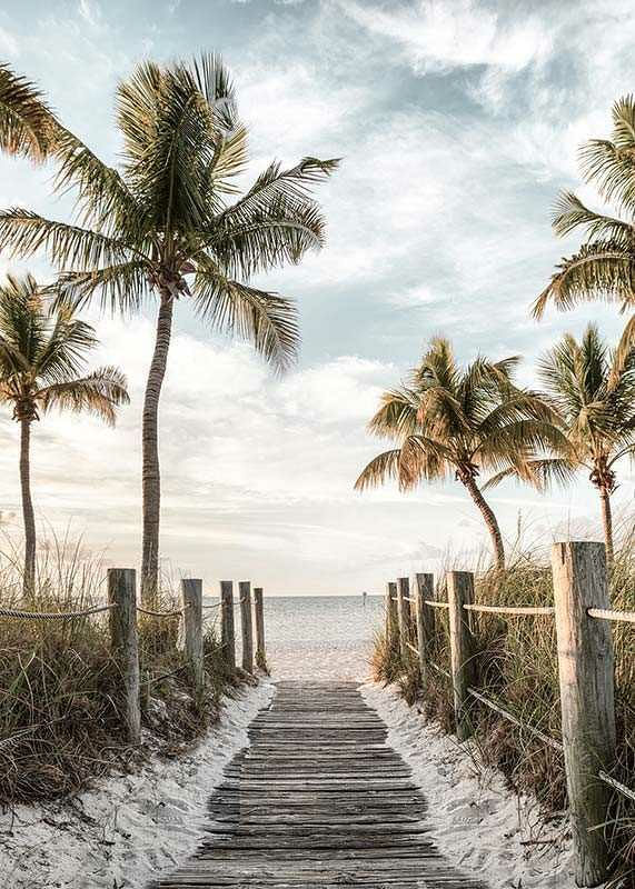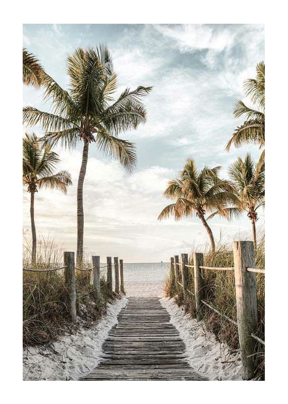 A wooden path leads through dunes and grass down to a bright beach, surrounded by tall palm trees on both sides. In the background is a calm sea and a softly cloudy sky in muted blue and beige tones. This poster gives a summery feel and creates a relaxed atmosphere in a living room or hallway.