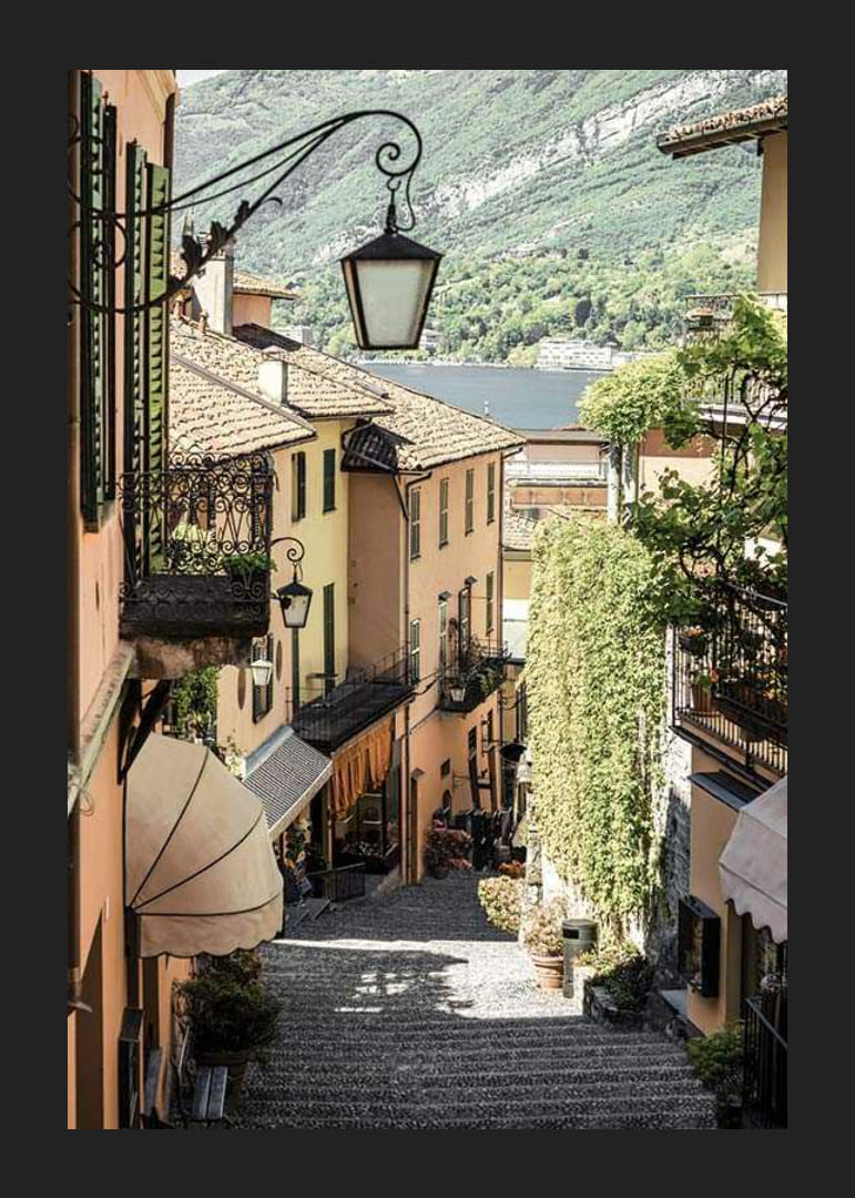 A cobblestone alley is lined with peach-colored facades, wrought-iron balconies, and green plants in Bellagio, Italy. A glimpse of the lake and green mountains can be seen in the background. This poster captures Italian small-town charm and architectural details - perfect for homes with a sense of travel and city life.