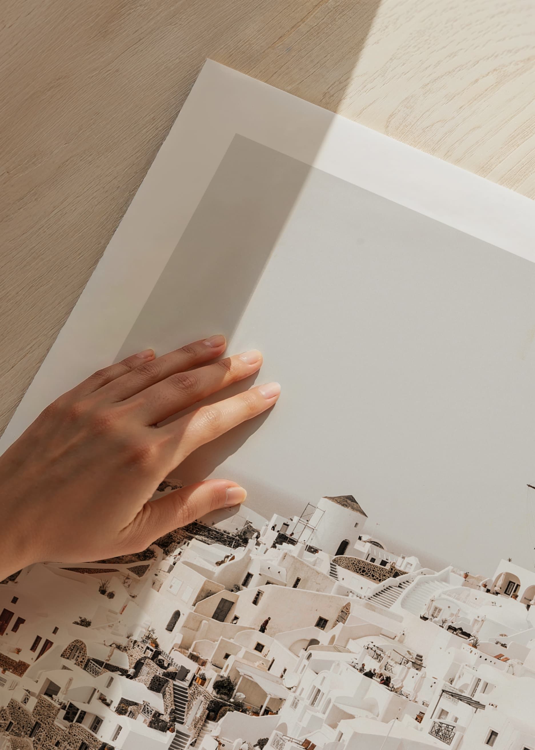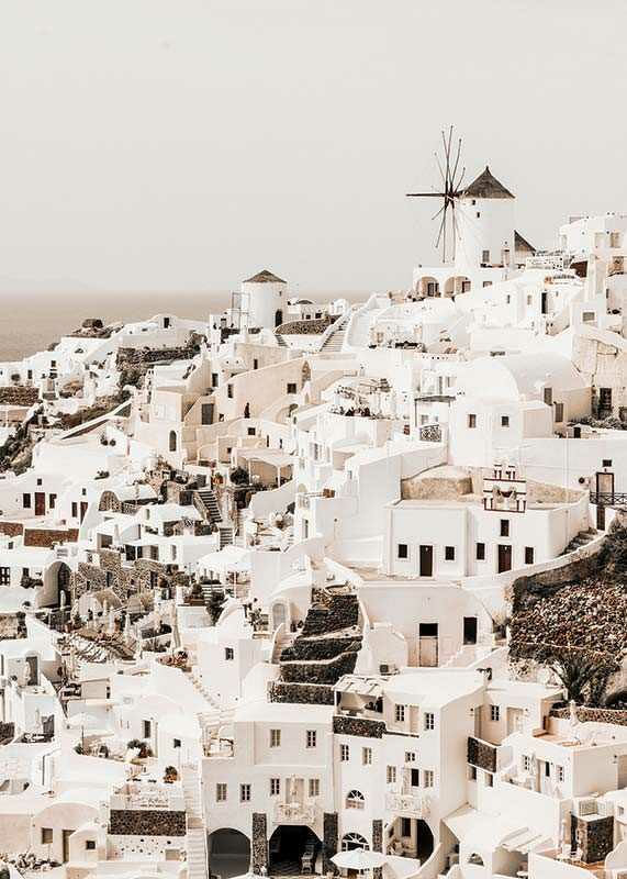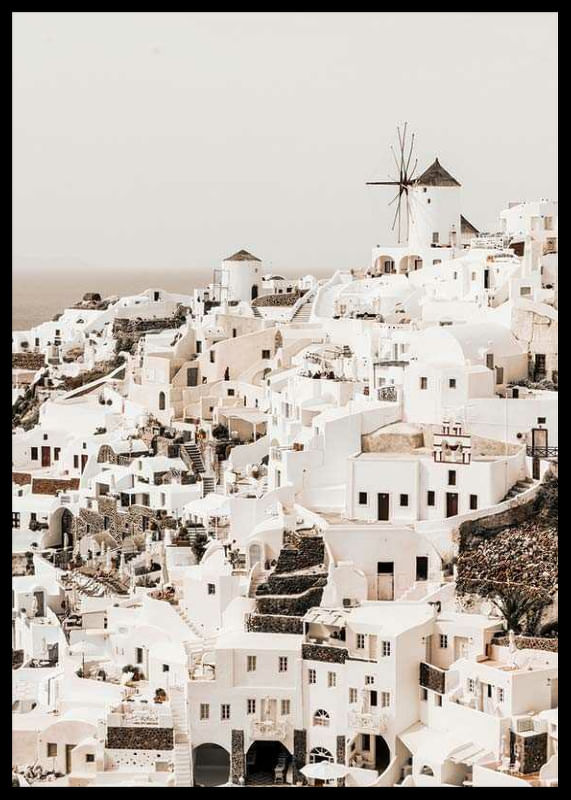 Hilly white buildings climb the hillside in the coastal village of Oia on the Greek island of Santorini. Soft beige tones and understated details create a light and airy feel. A classic windmill rises above the buildings and the sea is glimpsed in the distance. This poster adds a Southern European touch and works well in a living room, study or hallway.
