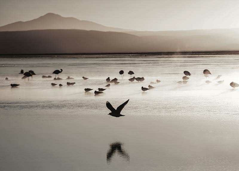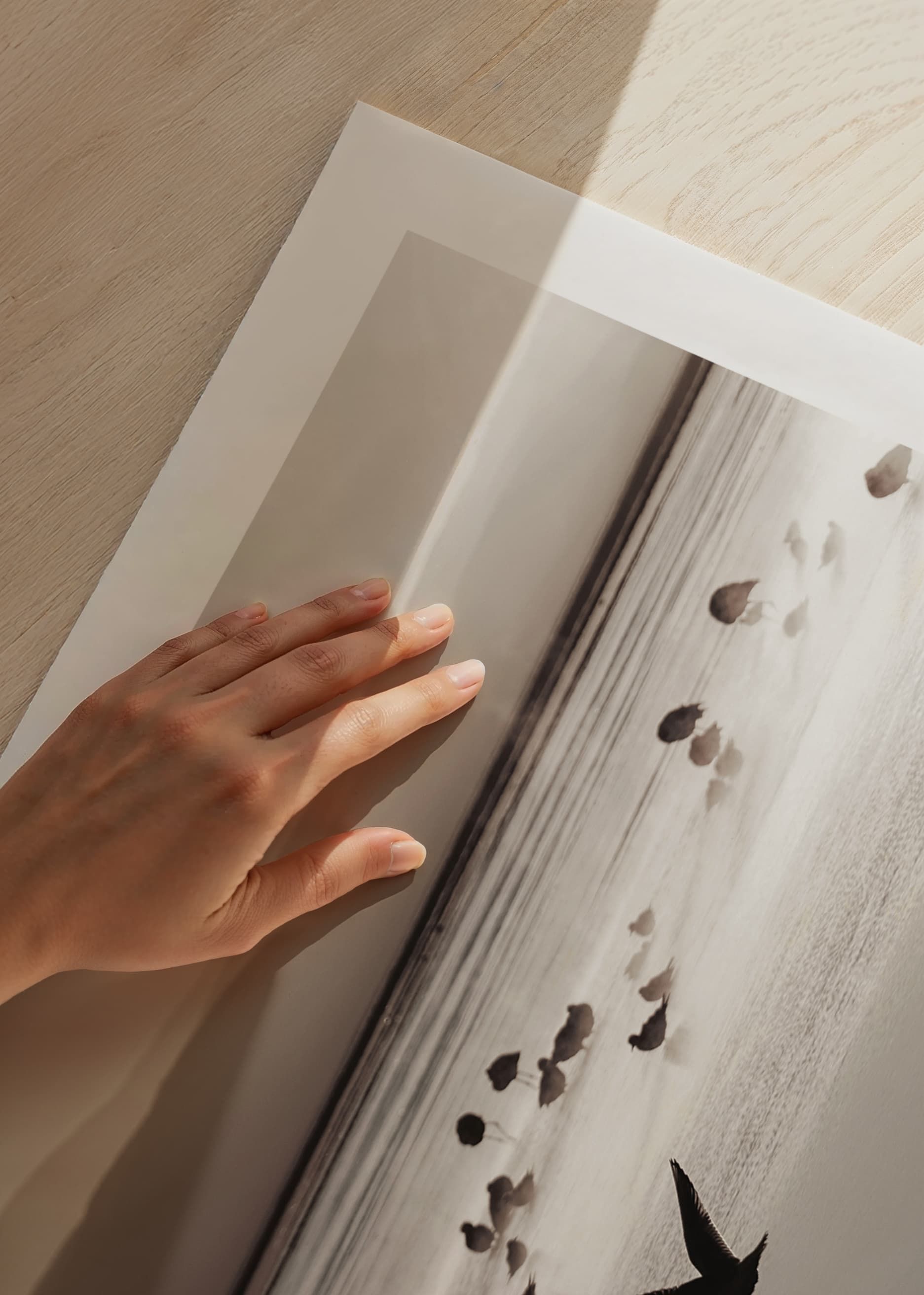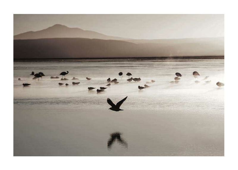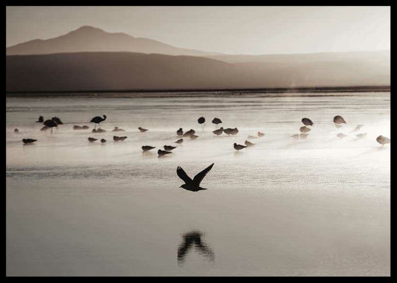 Silhouettes of wading birds gather along the shoreline in shallow water with a mountainous landscape in the background. Misty morning tones and reflections in the water enhance the peaceful atmosphere of the motif. This poster exudes the tranquility of nature and fits discreetly in both living rooms and study rooms.