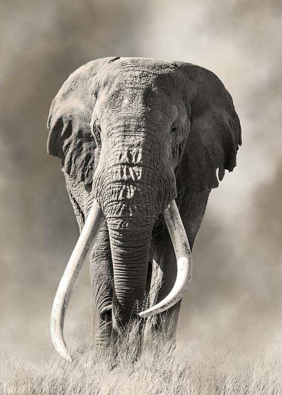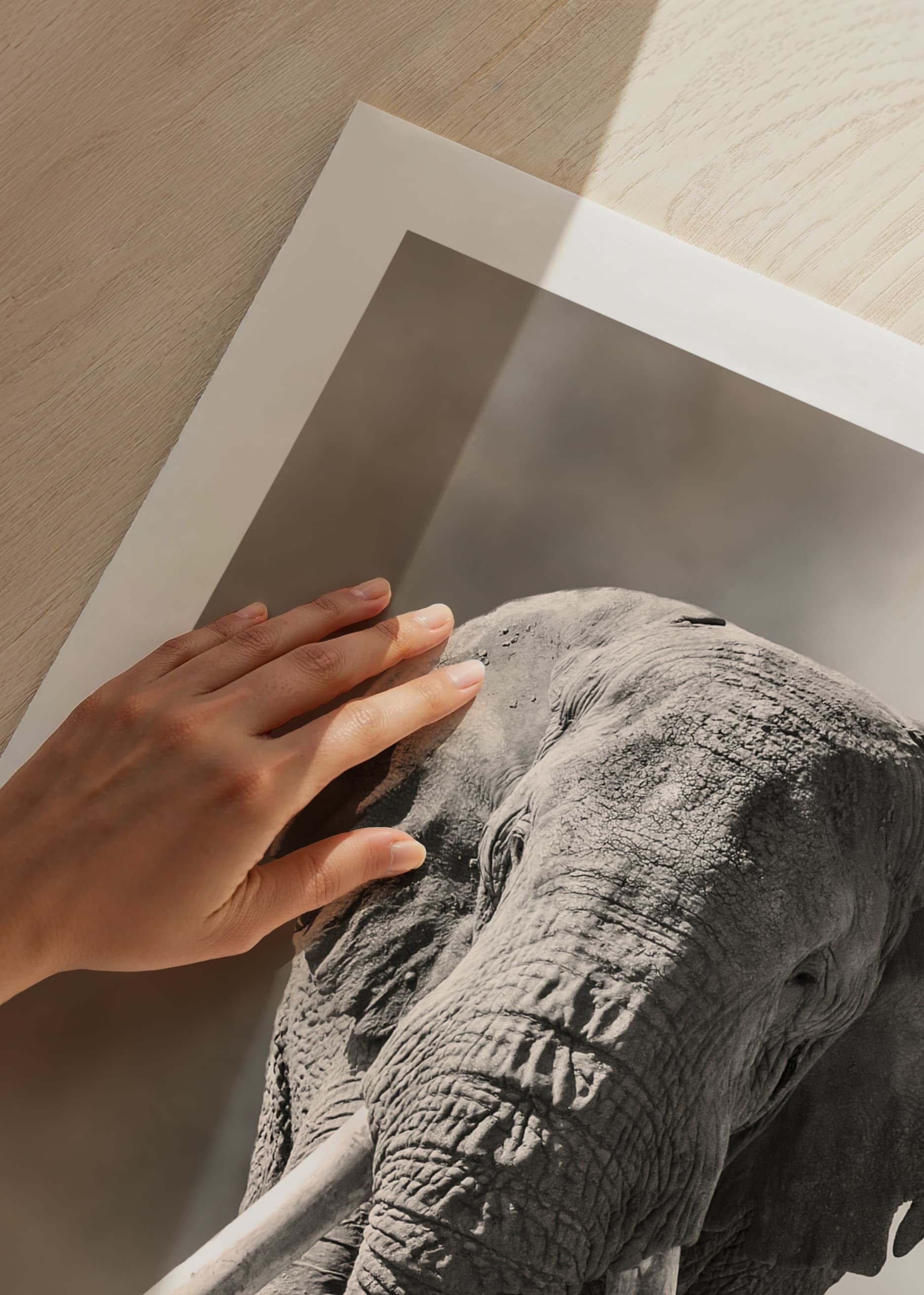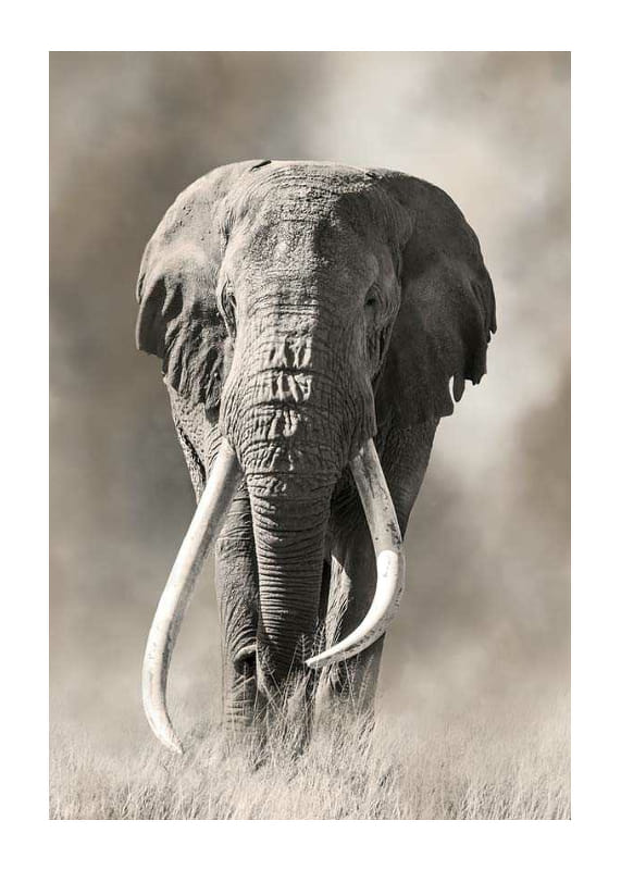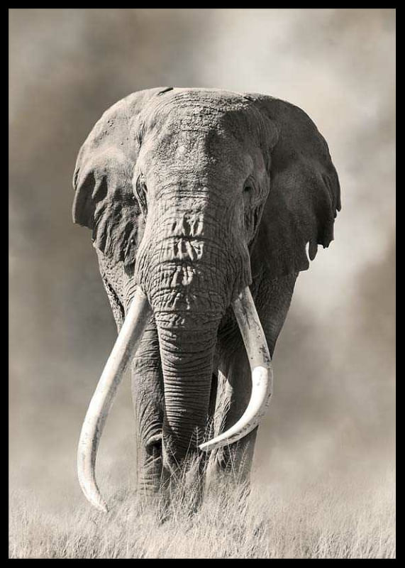 A close-up of an African elephant standing frontally in tall, light grass. The long, curved tusks and prominent skin folds are captured in a monochrome color scheme that emphasizes the animal's size. With its powerful motif, the poster serves as an expressive eye-catcher in a living room or study.