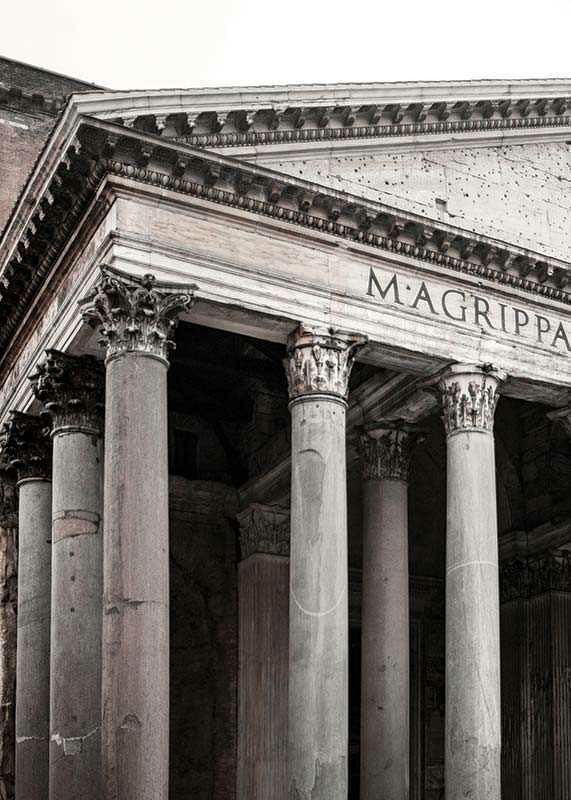 Powerful marble columns and detailed Corinthian capitals on the facade of the Pantheon in Rome dominate the motif. The Latin inscription and the natural hues of the stone capture the timeless feel. This poster highlights classical architecture and the heritage of antiquity, perfect for historic elegance in the home.