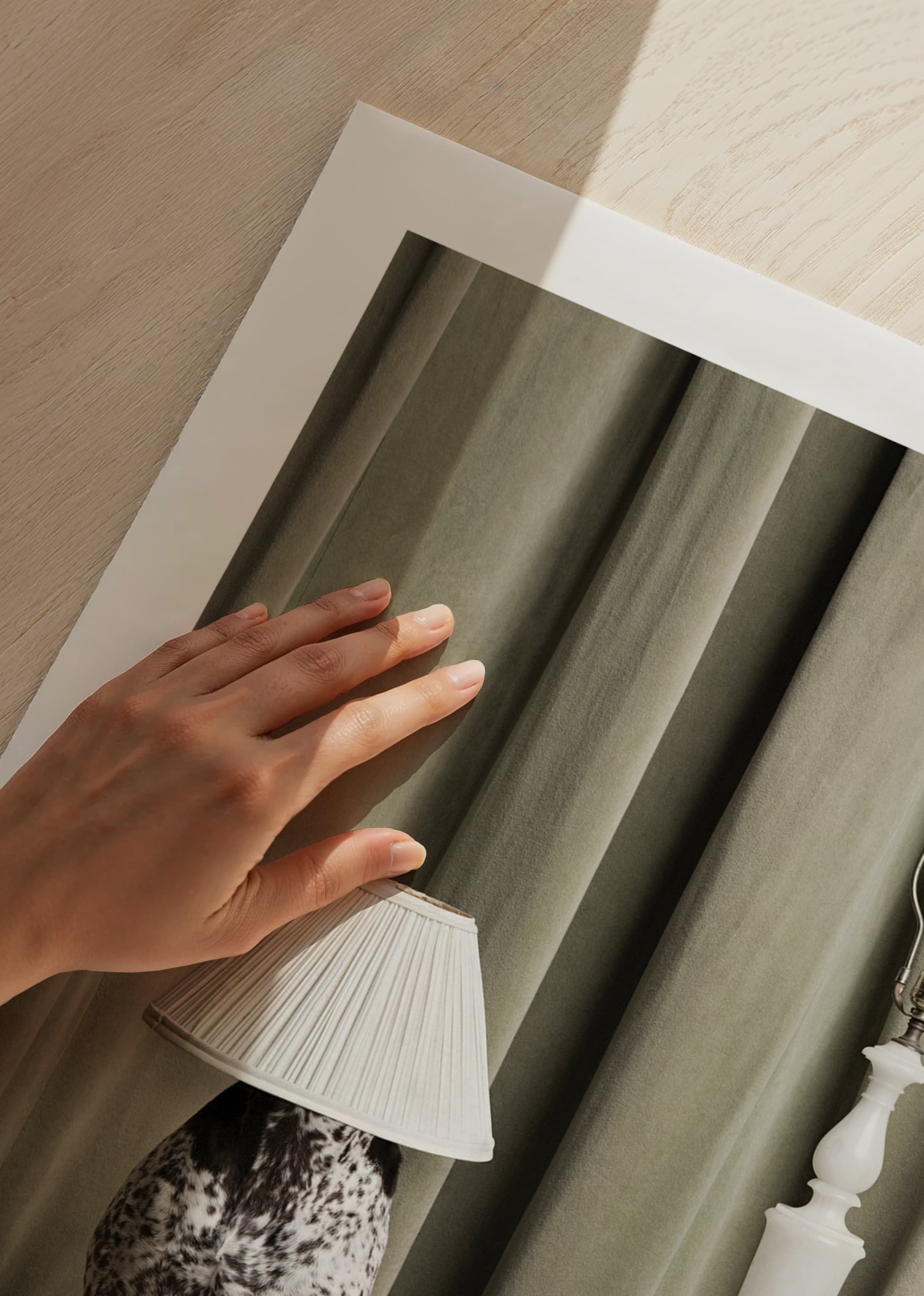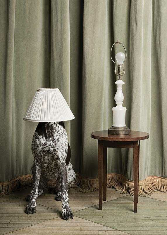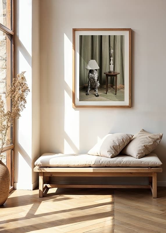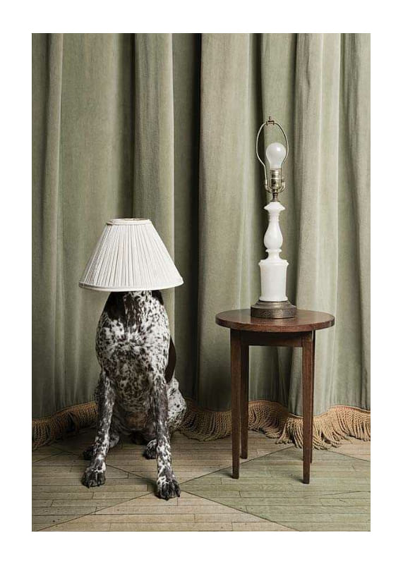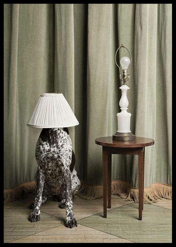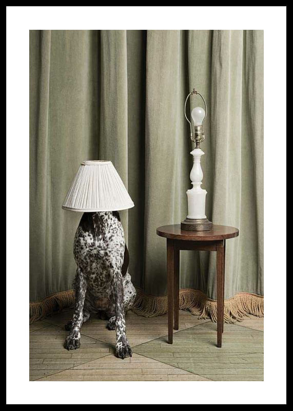 A Dalmatian sits in front of green velvet curtains with a white lampshade over its head. Next to it is a small wooden table with a lamp that is missing the shade. This poster combines humor and vintage feel through its unexpected motif and muted color scheme, and is suitable for rooms where personal interior details make a difference.
