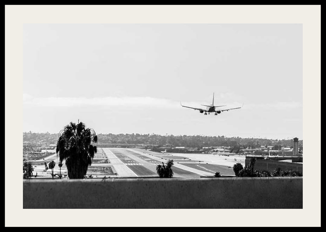 Airplane approaching the runway at an airport, captured in black and white with a view of the city skyline and some palm trees in the foreground. The graphic expression and clear lines contribute to a timeless feel. This poster is suitable for a study or living room where an interest in motors or a love of travel can take place.