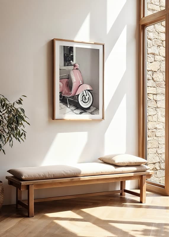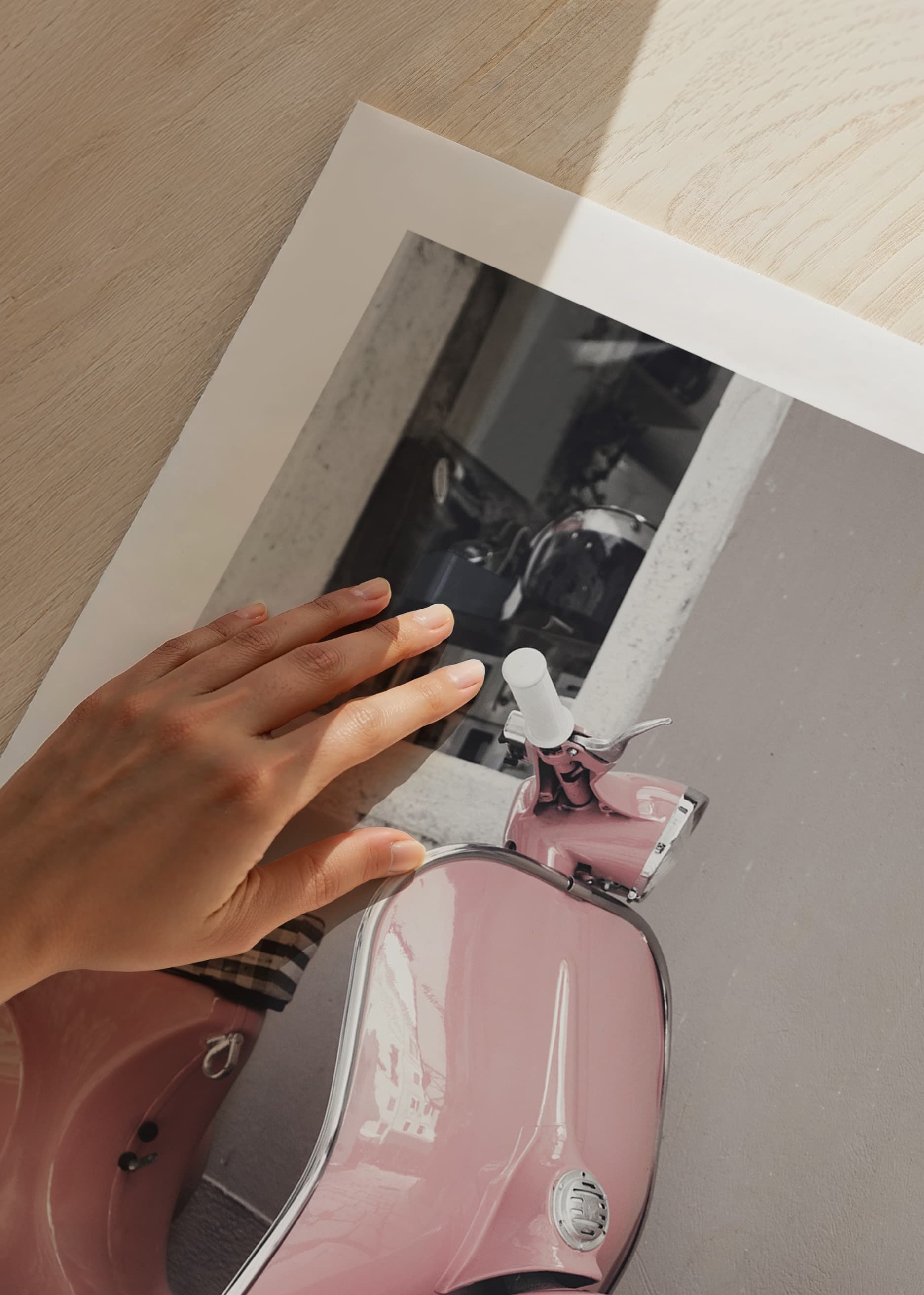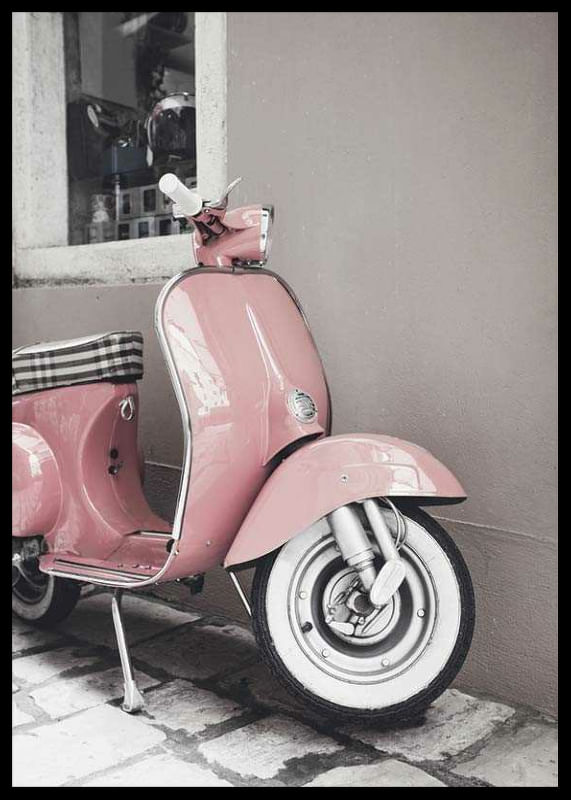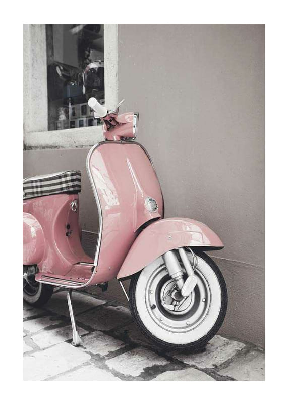 A classic Vespa scooter in light pink with a checkered saddle cover is parked next to a grey wall on cobblestoned ground. The chrome details and the period design give the motif a distinctly vintage feel. This poster is perfect for rooms where you want to add a playful retro character.